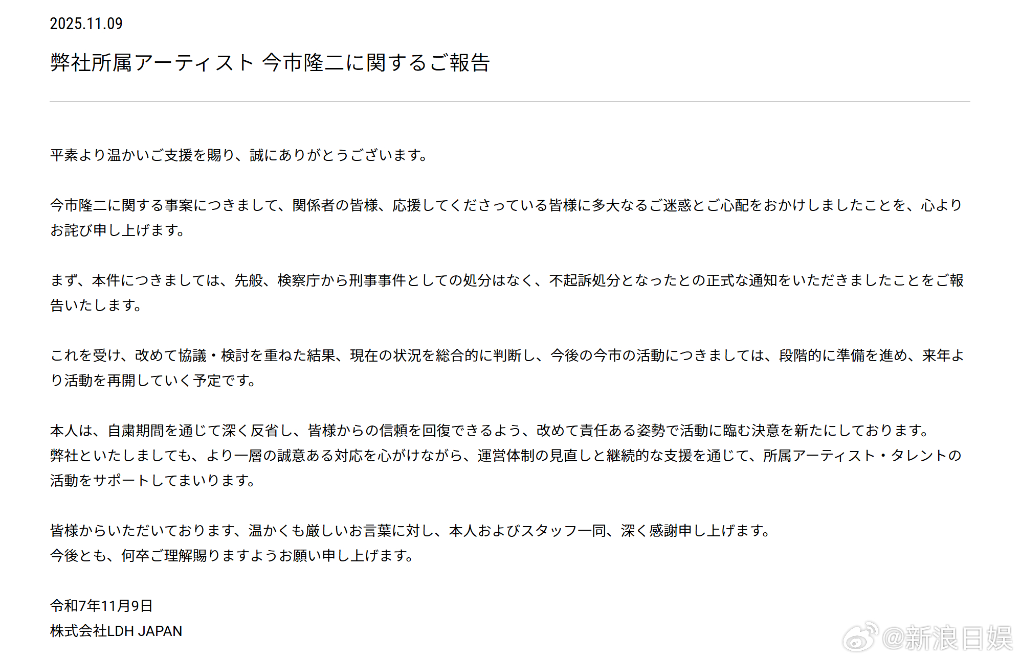 三代目J SOUL BROTHERS成员今市隆二确认将于2026年恢复活动。