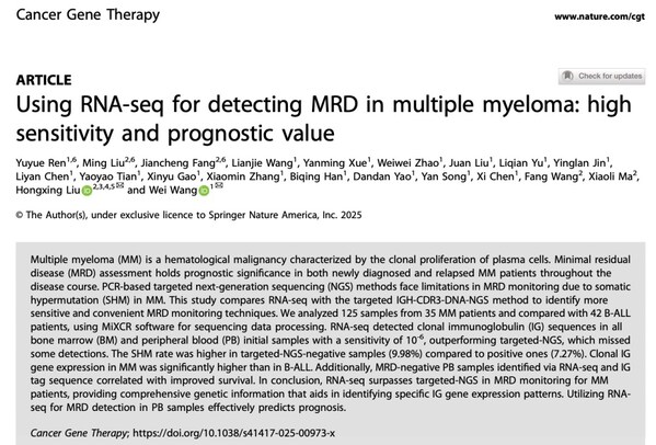 北京2025年11月10日--近日,陆道培分子医学团队与哈尔滨医科大学第二医院(哈医大二院)合作的研究成果,发表于Nature出版集团旗下学术期刊CancerGeneTherapy(IF=5.0)。论文题为:UsingRNA-seqfordetectingMRDinmultiplemyeloma:highsensitivityandprognosticvalue。本研究首次建立了一套基于全转录组测序(RNA-seq)的高灵敏度、高准确性的多发性骨髓瘤(MM)微小残留病(MRD)监测新流程,并系统验证了其在MM-MRD临床监测中的准确性与临床价值,为MM治疗监测提供了一种更灵敏、更准确的新策略。