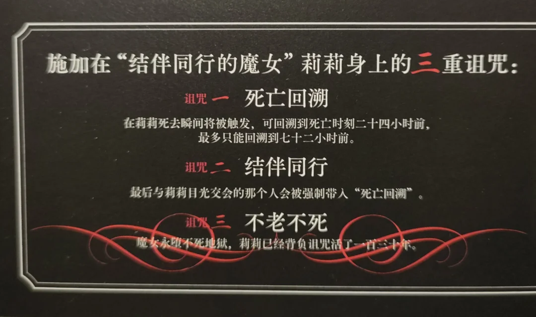 暴雨彻夜未息。清晨众人惊愕发现,珂蒂被人斩首,惨死于卧房,现场为密室状态。随后,莉莉也遭到枪杀。濒死前,她要希斯注视自己的双眼,将其带回了一天前的时空。原来莉莉竟是个被诅咒的魔女,拥有“死亡回溯”“结伴同行”“不老不死”三个特殊能力。
