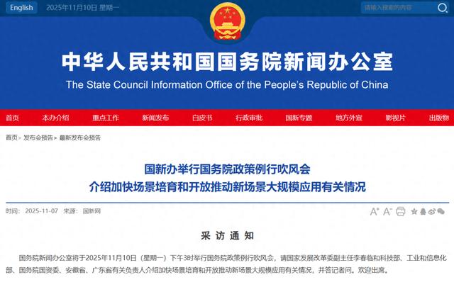 国务院新闻办公室将于2025年11月10日(星期一)下午3时举行国务院政策例行吹风会,请国家发展改革委副主任李春临和科技部、工业和信息化部、国务院国资委、安徽省、广东省有关负责人介绍加快场景培育和开放推动新场景大规模应用有关情况,并答记者问。