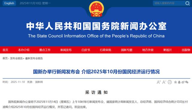 国务院新闻办公室将于2025年11月14日(星期五)上午10时举行新闻发布会,请国家统计局新闻发言人、总经济师、国民经济综合统计司司长付凌晖介绍2025年10月份国民经济运行情况,并答记者问。