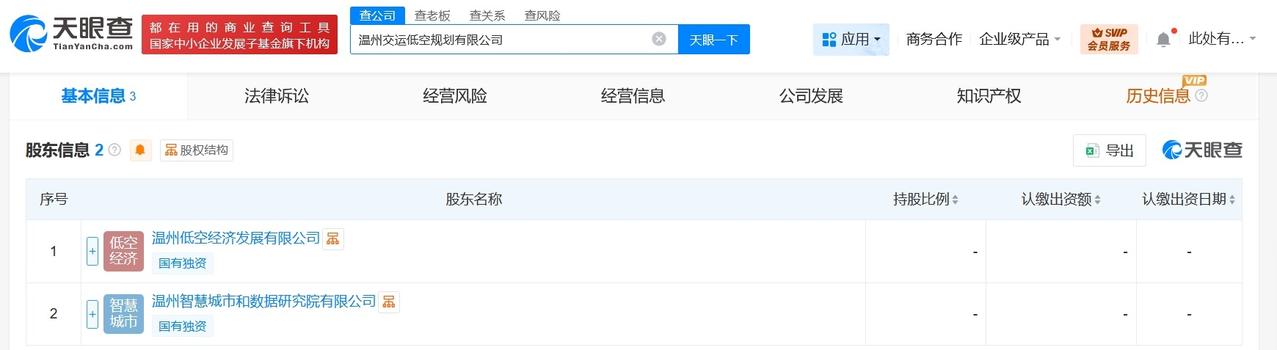 温州市交通运输集团等成立低空规划公司注册资本300万 天眼查工商信息显示,近日,温州交运低空规划有限公司成立,法定代表人为侯明明,注册资本300万人民币,经营范围含航空商务服务、航空运营支持服务、咨询策划服务、政策法规课题研究、规划设计管理、数字内容制作服务、信息技术咨询服务、信息系统集成服务等。股东信息显示,该公司由温州市交通运输集团旗下温州低空经济发展有限公司以及温州智慧城市和数据研究院有限公司共同持股。 天眼查信息: