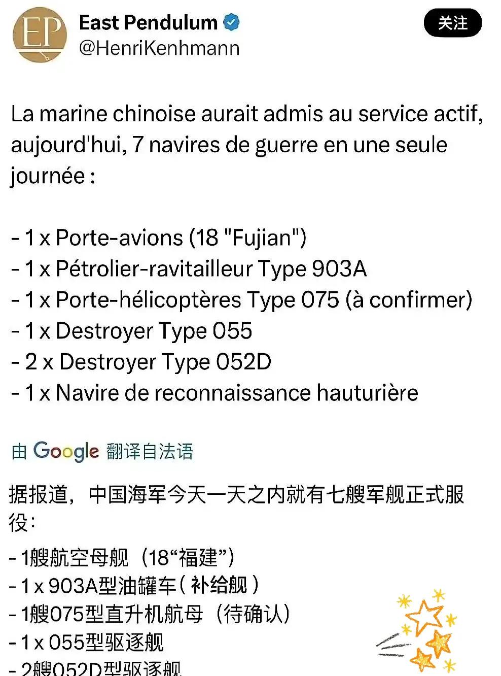刷到一个消息,说是法国人那边传的,差点给我看傻了。 他们说,咱们的福建舰入列,根本不是一艘船的事儿。 是一整个航母编队,直接“满配”出道。 你琢磨琢磨这个画面感: 一艘巨无霸航母在C位。 055万吨大驱护驾、052D中华神盾护航, 还有903A补给舰续航兜底, 075两栖攻击舰镇场, 水下“大黑鱼”潜伏, 连电子侦察船都配齐, 这配置哪是军舰编队, 分明是移动的远海安全感堡垒。 更牛的是, 这波入列吨位相当于法国海军的42%, 西方媒体都惊叹这是二战后最惊人的海军发展速度。 以前听长辈说海军曾“一穷二白”, 安全感只能靠想象; 现在才懂,真正的安全感从来不是喊出来的, 是福建舰的电磁弹射、是满配编队的硬实力, 实打实拼出来的。 你被福建舰这满配阵容震撼到了吗? 来评论区聊聊你心中最燃的点!