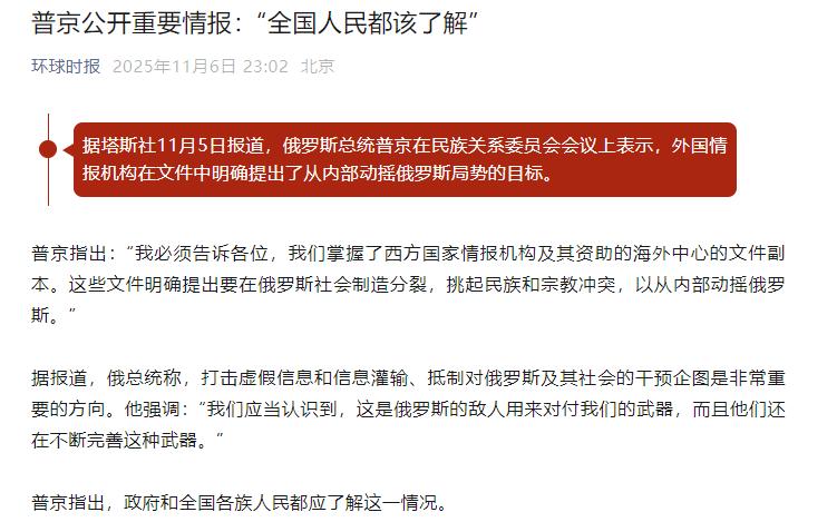 普京公开重要情报:“全国人民都该了解”,中国也要小心。 据报道,俄罗斯总统普京近日在一次重要会议上向全国发出明确警告,指出西方国家正有计划地试图从内部破坏俄罗斯的稳定。 普京抛出的这番警告,可不是空穴来风,手里是攥着真凭实据的——西方国家情报机构的文件副本就摆在那,白纸黑字写着要在俄罗斯社会制造分裂、挑起民族和宗教冲突,从内部撬动这个国家的稳定根基。 这事儿往深了扒就会发现,西方搞这套渗透简直是轻车熟路,堪称“祖传手艺”,俄罗斯不过是他们众多目标里的一个重点对象。 最典型的工具就是美国国家民主基金会,也就是NED,这机构说穿了就是美国政府掏钱办事的“白手套”,2023财年国会给它的拨款就高达3.15亿美元,这些钱大多流进了针对他国的“民主项目”,本质上就是搞颠覆的启动资金。 俄罗斯早看透了它的底细,2015年就直接把它列为“不受欢迎组织”,禁止在境内活动,因为这机构一直在资助俄罗斯境内的非政府组织,专门盯着年轻人下手,试图磨掉他们的爱国主义思想,还刻意贬低俄罗斯在国际上的地位,摆明了是要从根上蛀空社会共识。 西方这套“内部瓦解术”的套路早就被拆解得明明白白,先找目标国的薄弱点,多民族、多宗教的国家最容易被盯上,然后砸钱扶持代理人,再用媒体和网络煽风点火。 2004年乌克兰的“橙色革命”就是教科书级别的操作,美国通过NED和其他机构给反对派砸了6500万美元,连示威者用的帐篷、橙色服饰都包了,还培训了上千名所谓的“选举监督员”搞虚假民调,最后硬生生把局势搅乱,扶持起亲西方政权。 这套玩法后来在土耳其也用过,2022到2023年,NED资助当地数字媒体平台散播不满情绪,专门挑动种族矛盾,就等着局势失控。 现在技术升级了,西方的手段也更隐蔽,不再只靠街头抗议,网络成了主战场。 就像“阿拉伯之春”那会,脸书用来定抗议日程,推特协调行动,油管放大声量,谷歌还专门推出“对推特说”服务,帮抗议者在断网时保持联系,甚至研发加密服务器让他们匿名活动,这些技术支持都是美国国务院砸钱搞的,光“反审查”信息系统就投了3000多万美元。 俄罗斯自然也躲不过这套,境外势力通过社交媒体推送虚假信息,一会儿挑唆某个少数民族与主体民族的矛盾,一会儿在宗教问题上制造对立,就是想让社会陷入内耗。 值得警惕的是,西方搞渗透可比他们搞内政要有耐心的多,长期潜伏是经常有的事。 NED在塞尔维亚科索沃地区资助智库多年,一边挑唆塞政府和当地自治机构的矛盾,一边还把科索沃粉饰成“民主成功案例”,这种潜移默化的分裂灌输,比直接挑事更阴狠。 俄罗斯能拿到那些情报文件,说明已经抓了现行,知道西方正盯着自己的民族和宗教议题下手,毕竟俄罗斯民族众多,一旦被撕开口子,后果也是不堪设想的,这也难怪普京要特意强调“全国人民都该了解”。 老美的这套操作,从不是单一对准某国,从东欧的“颜色革命”到中东的乱局,再到针对俄罗斯的渗透,套路都是一样的:找弱点、砸资金、扶代理人、搞舆论战。 而我国作为多民族国家,自然也是他们试图渗透的目标,毕竟从内部瓦解比正面对抗成本低多了,还能把责任推给“内部矛盾”,这种“杀人不见血”的手段,确实不得不防。