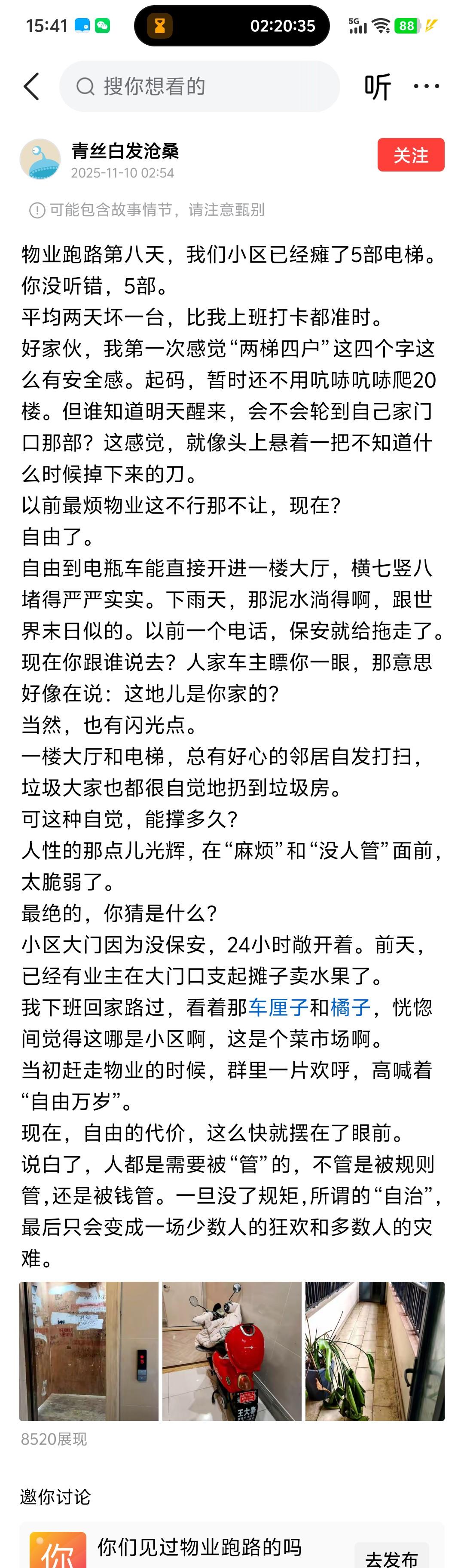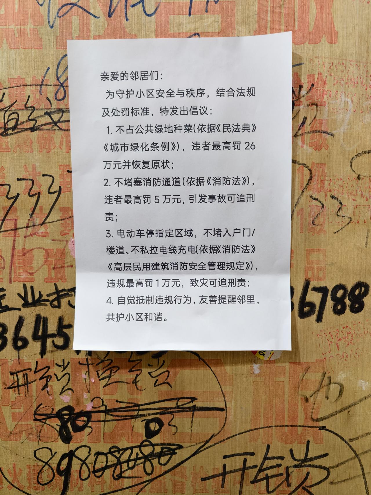 今天是金碧物业走后的第10天。 我记录这些是为了对比看物业走前和走后有什么区别,想不到今天遇到了抄袭。 他的图片顺序张数跟我都一模一样,内容也是一样的,只是加了一些描述和评论。 今天的电梯坏掉的总数回到了四部电梯。我们一共5栋楼11个单元,结构是2梯4户。昨天说6号楼有一位业主,自发的找人修好了他们那个单元坏掉了的电梯,有网友质疑说这是假的。在此我声明,我只做记录,真实的记录。如果不相信,你可以到我们小区来实地采访。 绿化带变菜地的问题,暂时还没有解决。业主自发的到各个单元的电梯里面贴上倡议书,谁知7号楼有业主把他们贴的倡议书撕掉了。估计菜地就是7号楼业主种的,他们毁坏的树有些价值上千元,种下的菜。为他们只能节省几元几十元?破坏了绿化,造成房价降低至少要多少万?真的是贪小便宜吃大亏。 1楼大厅停电瓶车的问题,我们单元还好,晴天基本上没有人停在大厅里面,但是到了下雨天,很多女同志会把家里的电瓶车停在大厅里,唯恐把她们的电瓶车淋湿了。 没有物业之后唯一变化不大的是卫生问题。小区并没有变得比过去更脏,跟过去差不多吧。6号楼有业主排上值班表,组织他们的业主,自己打扫电梯和1楼大厅。他们还把他们楼后面的建筑垃圾也清除出了小区。