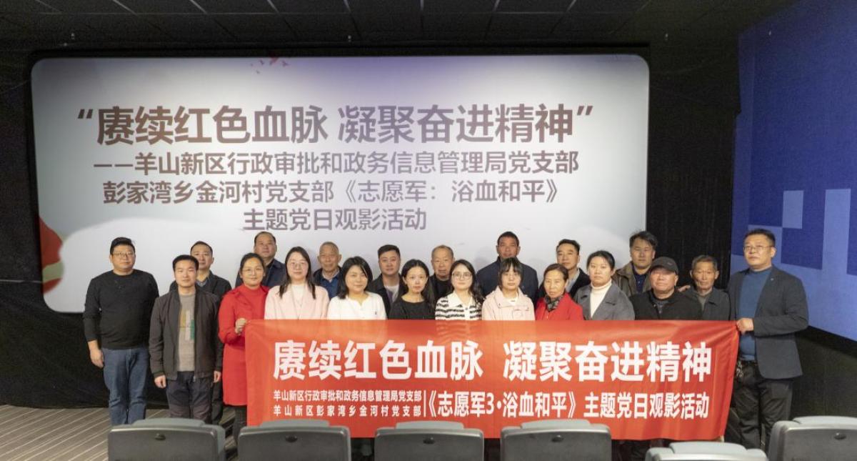 为深化基层党组织建设,推动城乡支部交流互促,11月10日上午,信阳市羊山新区行政审批和政务信息管理局党支部与彭家湾乡金河村党支部联合开展“赓续红色血脉凝聚奋进精神”主题党日活动,共同观看红色影片《志愿军:浴血和平》。共计20余名党员参加活动。