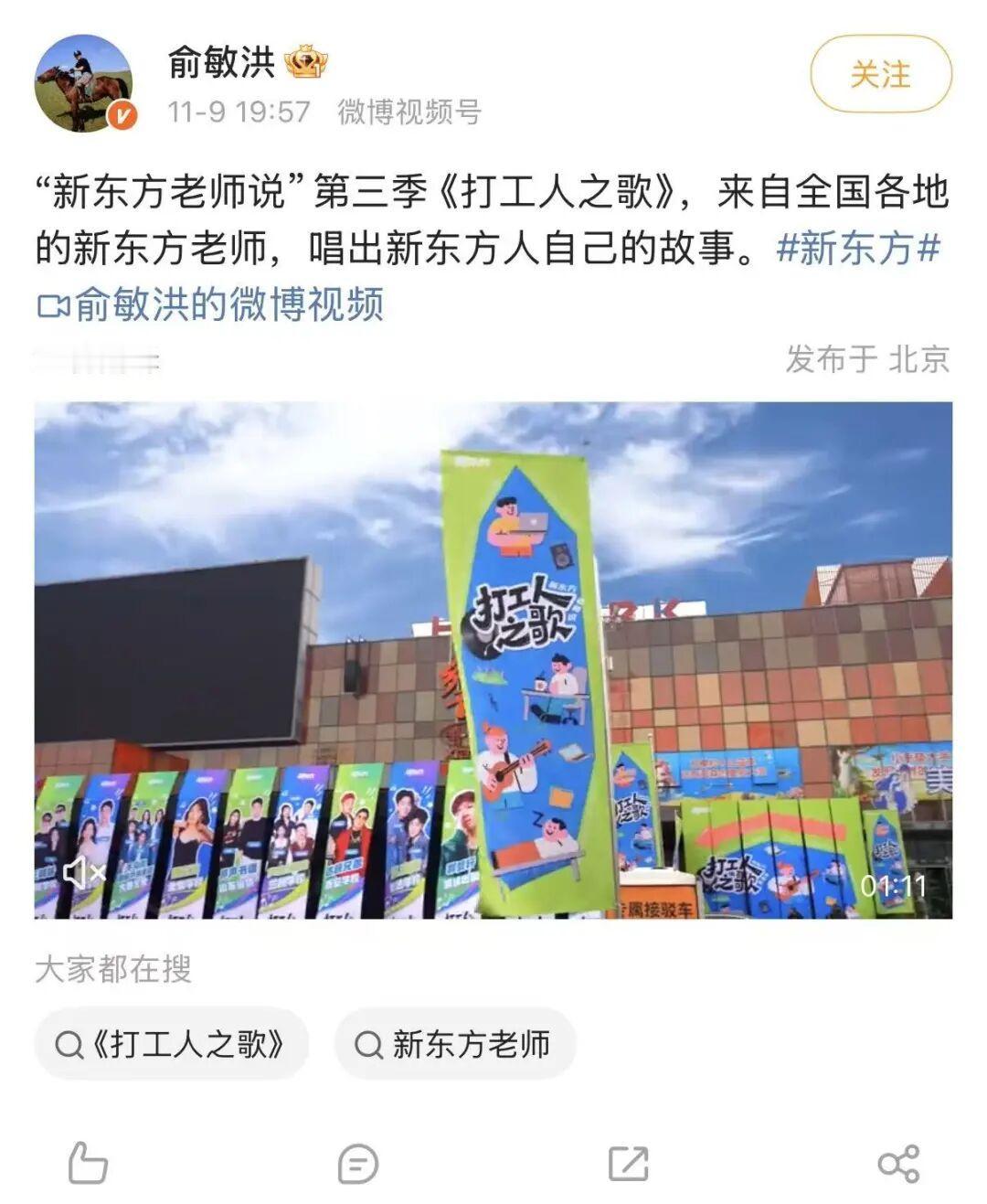 新东方员工再出新歌“骂”公司,俞敏洪曾奖励12万 Tech星球11月10日消息,据界面新闻报道,近日,新东方创始人俞敏洪在社交平台分享了一段员工创作的“吐槽公司”新歌视频,并配文称:“员工骂新东方的歌,最后没有忘记救命,哈哈。” 根据视频,这首歌吐槽了“日报、周报每天折磨我”“过节收到礼盒一个,不用想又是甄选的”“业绩导向、续费为王”“一边休假钉钉还在一直响”等内容。还调侃称,“受的委屈再大,也大不过俞敏洪”。 另外,俞敏洪也在微博平台发文称,“新东方老师说”第三季《打工人之歌》,来自全国各地的新东方老师,唱出新东方人自己的故事。