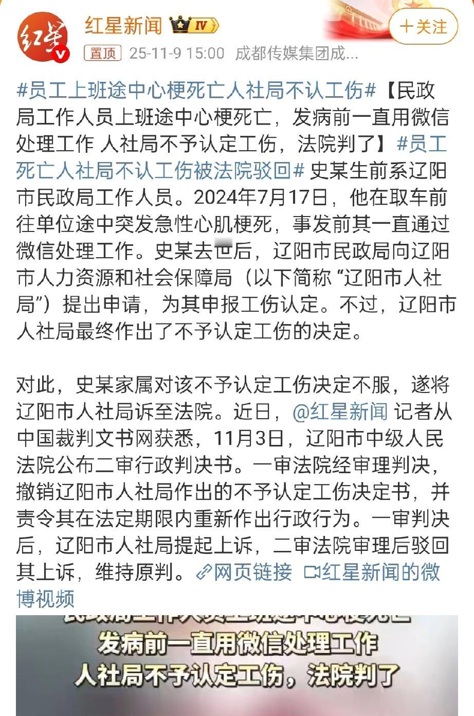 员工上班途中心梗死亡人社局不认工伤。 报道为啥不说明人社局不认工伤的依据是什么? 按理说,一个是民政局,一个是人社局,都当地的机构,人社局不至于这么较真的。现在经过法院二审,人社局仍然判定“不认工伤”,对判决不服。个人认为,可能人社局应该有一定的道理。现在报道中只有民政局的说法与声音,建议记者们补充报道。 当然,法治社会,既然已经二审宣判,人社局也应该认真对待,重新审核,重新决定。工伤判定标准 工伤规定 上班工伤