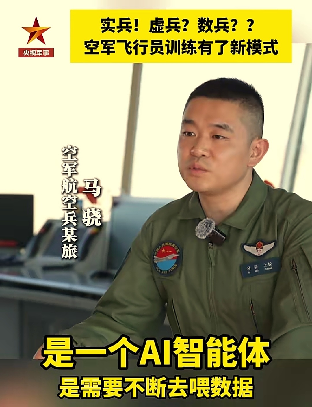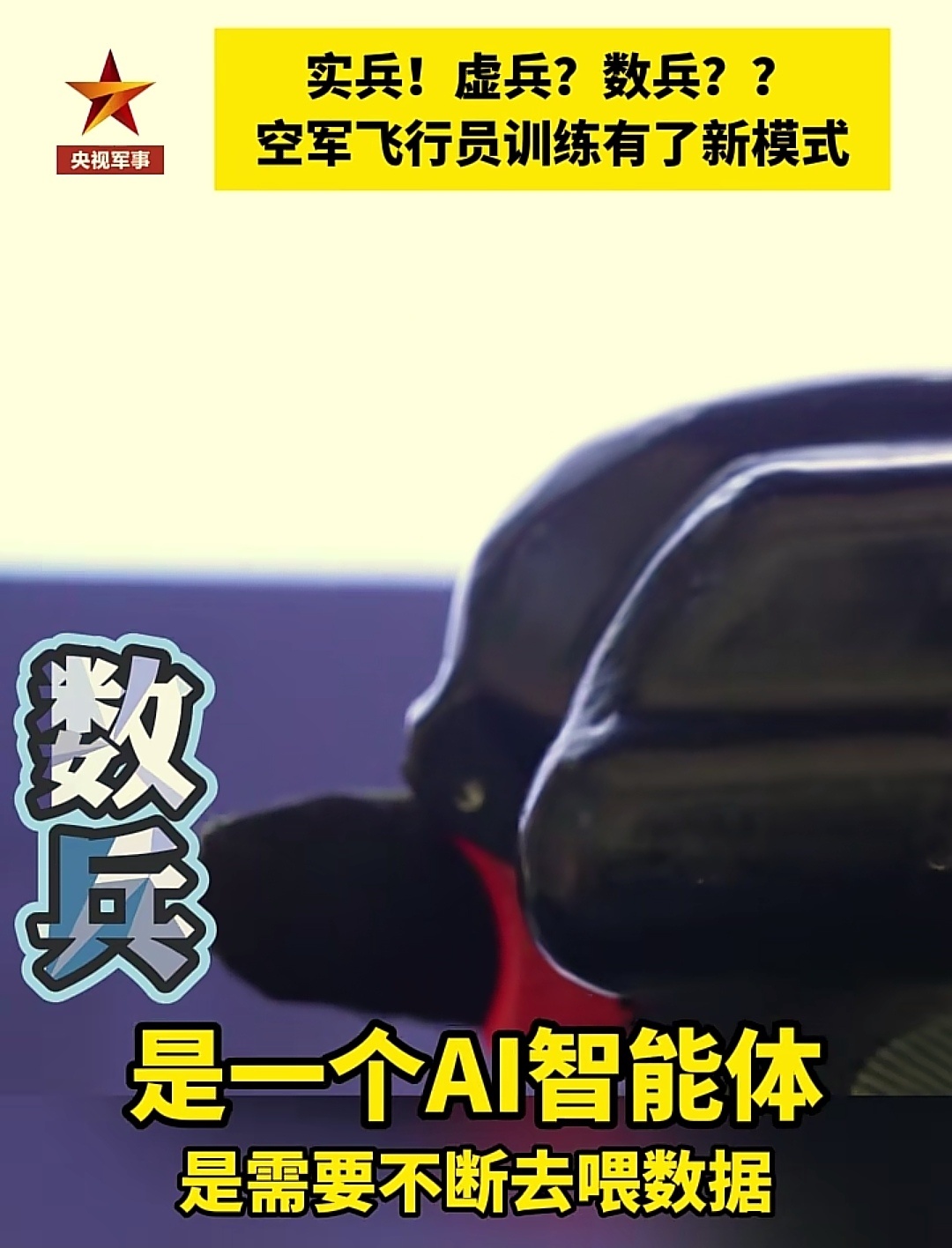 人民空军成立七十六周年空军战斗机部队训练新模式:实兵与虚兵和数兵联网对抗。实兵就是驾驶战机升空的飞行员,虚兵就是在地面操控飞行模拟器的飞行员,模拟器与天上的战机联网,进行实时对抗。数兵就是把地面联网对抗的对手换成了AI智能体。