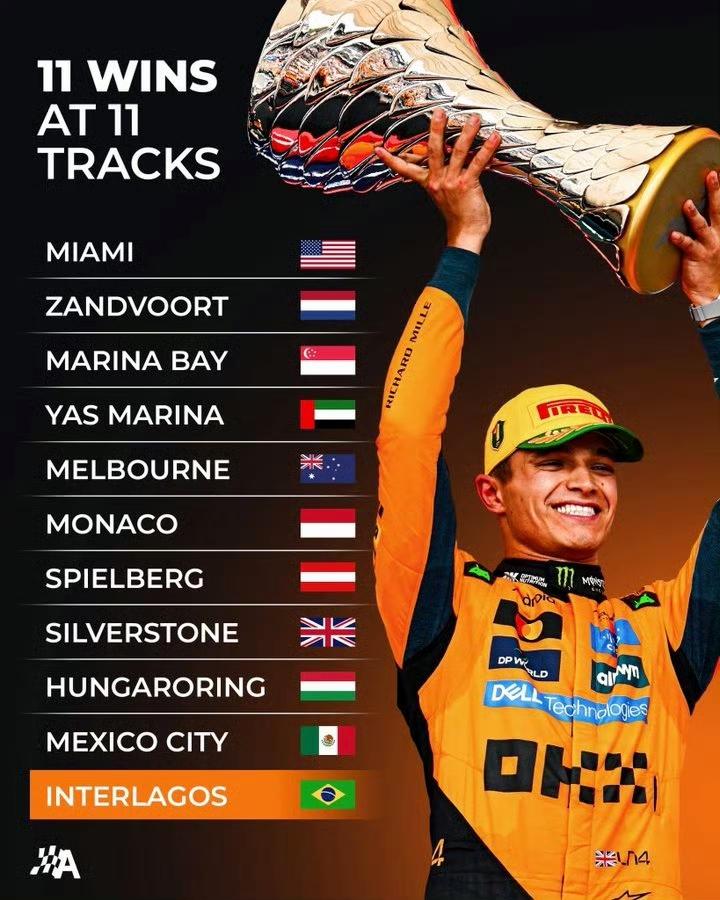 诺里斯成F1历史上首位生涯前11胜来自于11条不同赛道的车手