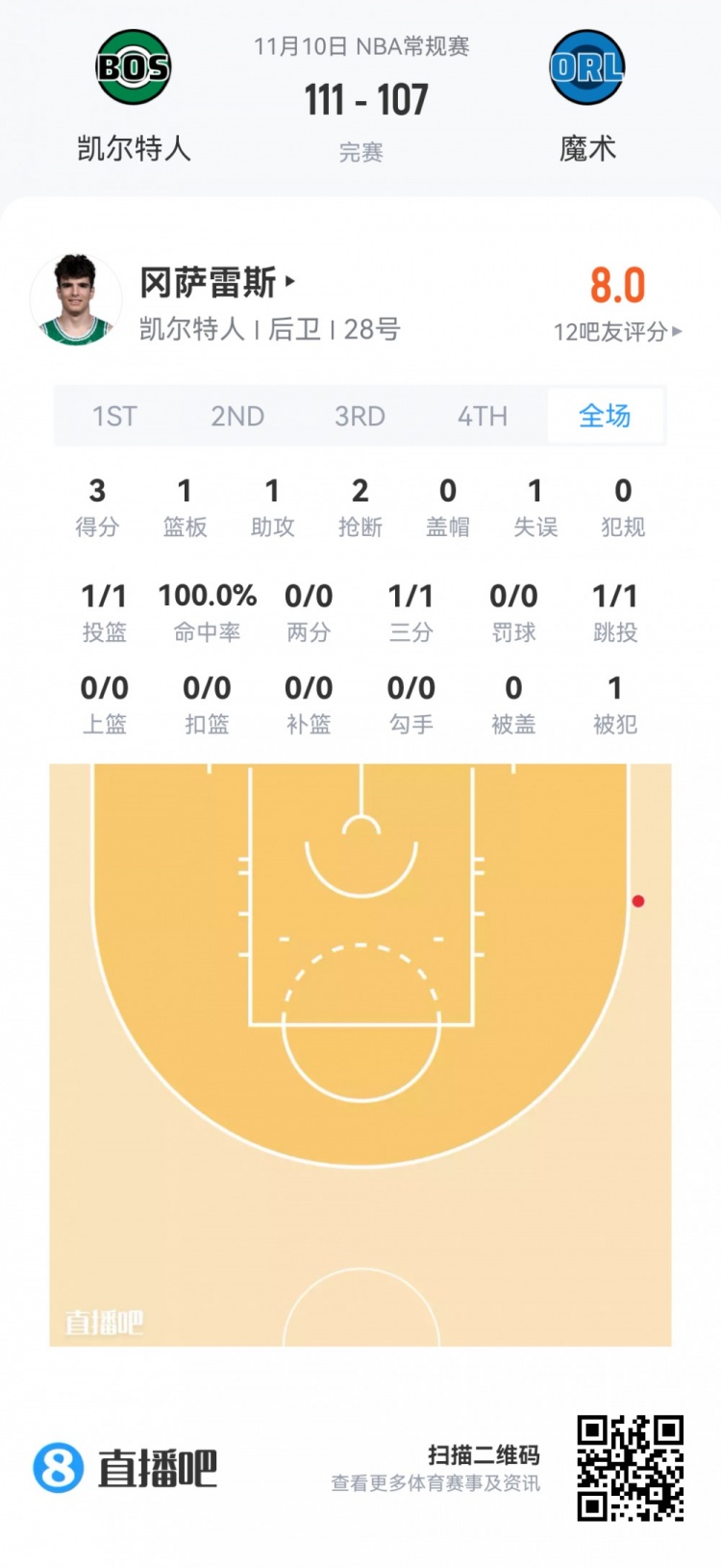 凯尔特人28号秀乌戈·冈萨雷斯登场12.6分钟