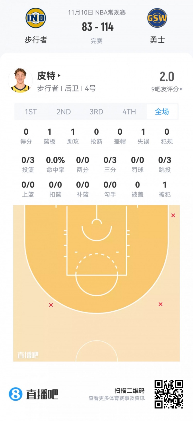 步行者次轮54号秀泰伦·皮特登场6.5分钟