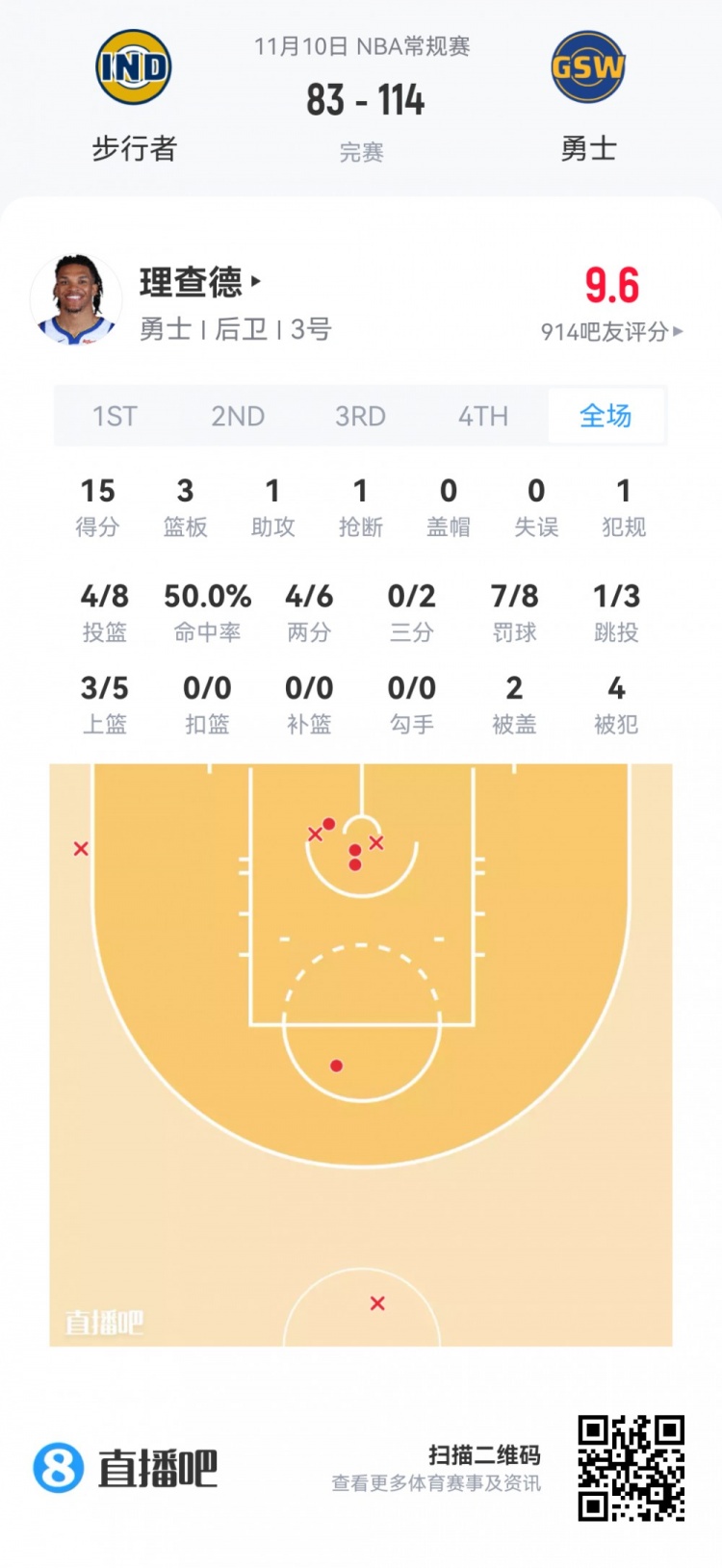 勇士次轮56号秀威尔·理查德登场19.5分钟
