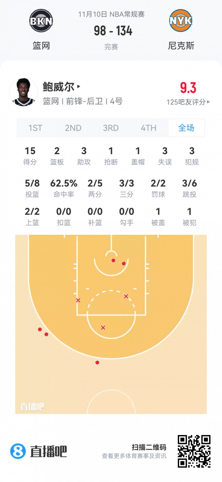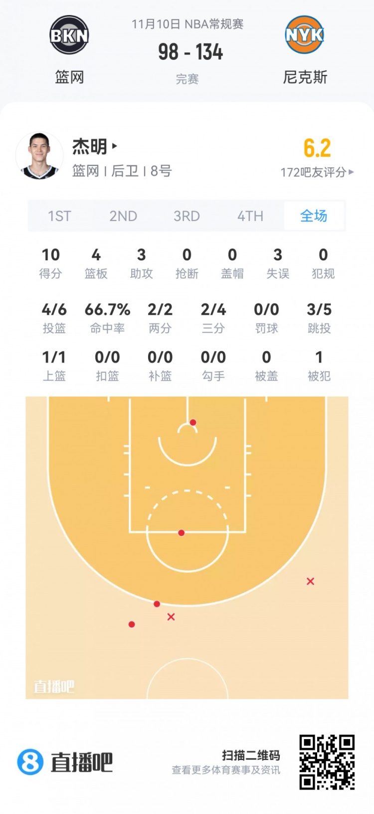 篮网8号秀叶戈尔·杰明登场25.5分钟