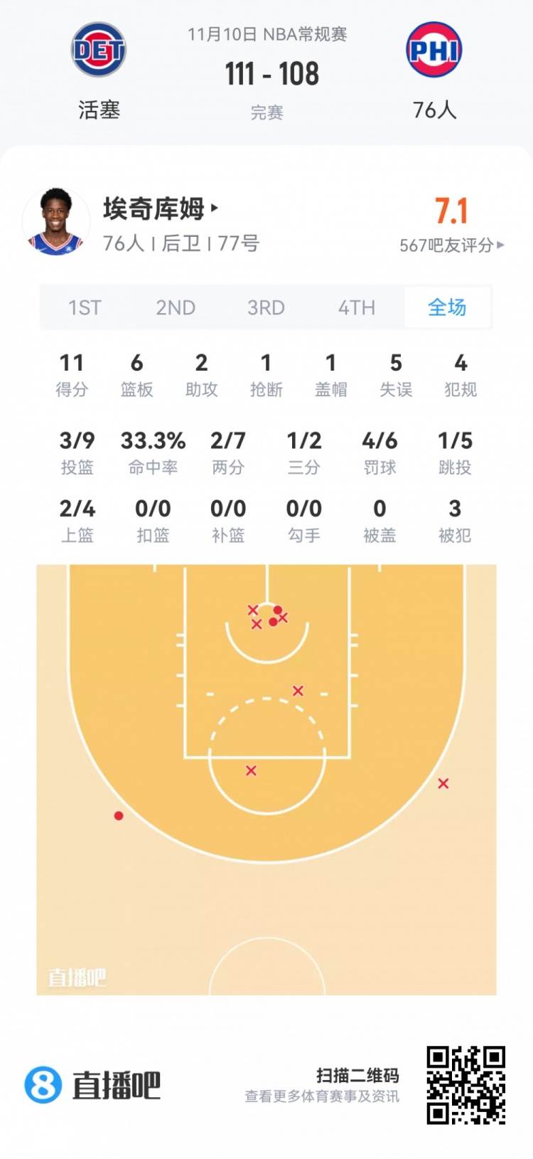 76人探花秀VJ·埃奇库姆登场31.7分钟