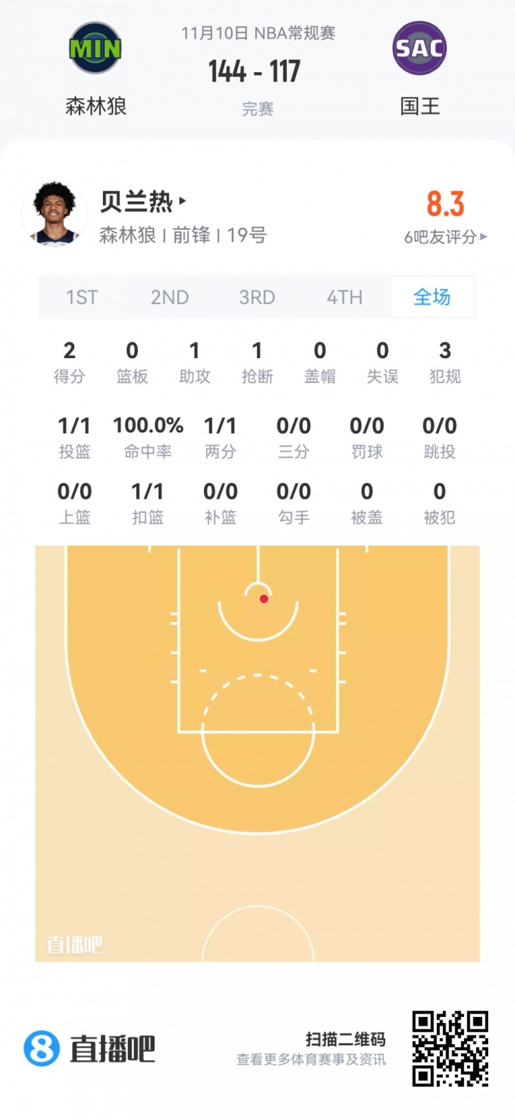 森林狼17号秀若昂·贝兰热登场5.6分钟