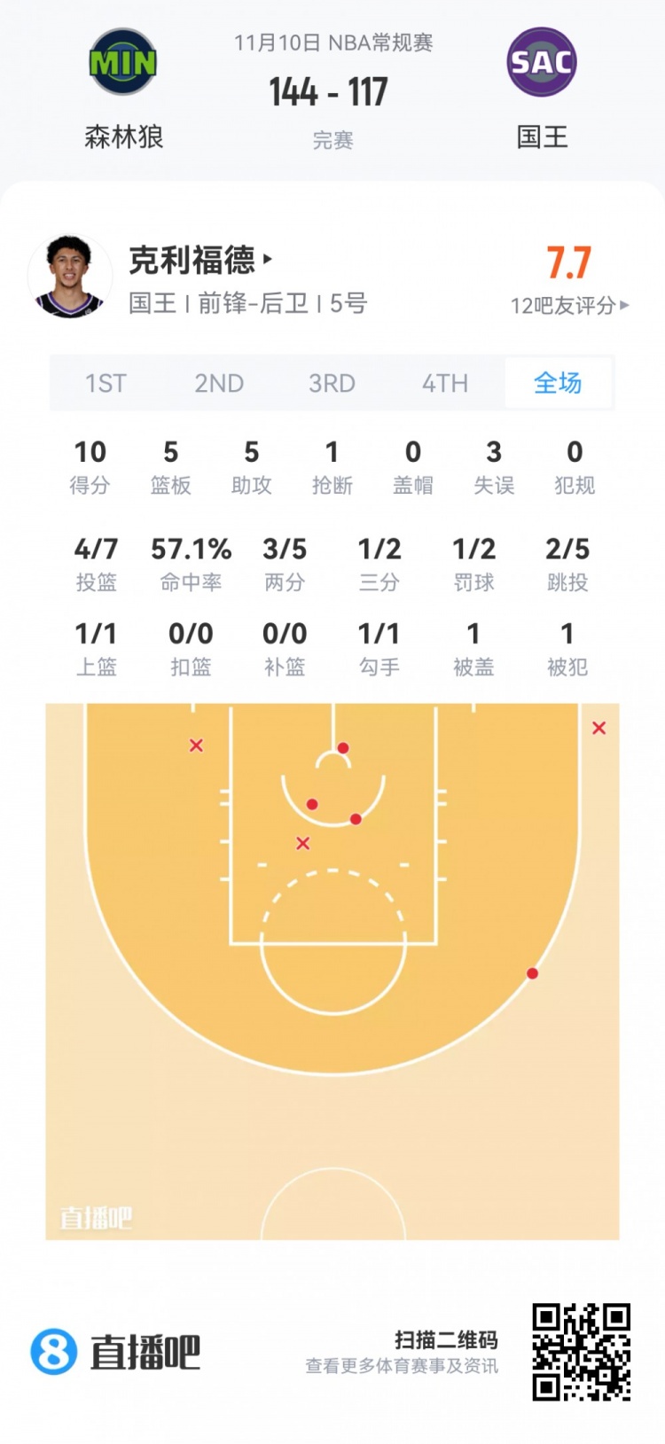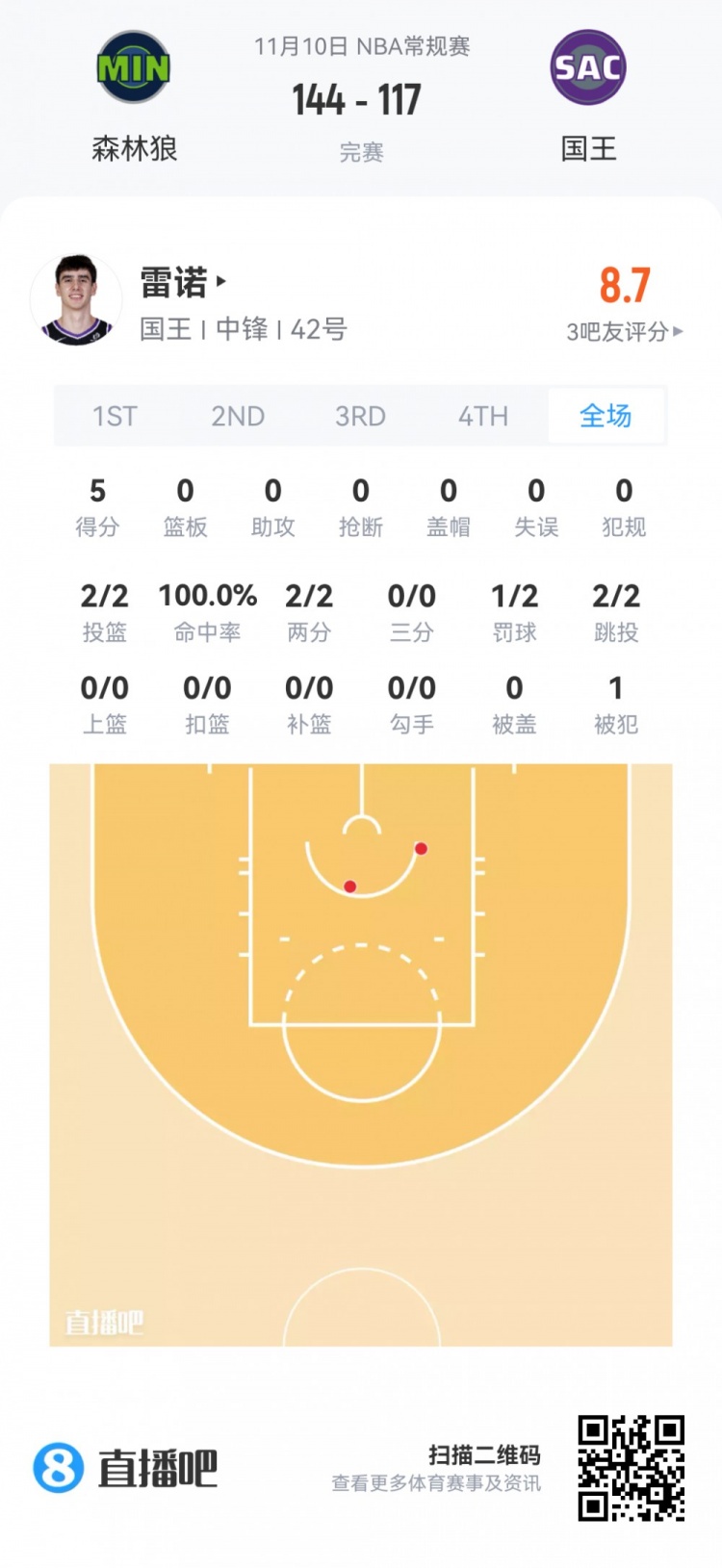 国王次轮42号秀马克西姆·雷诺登场4.8分钟