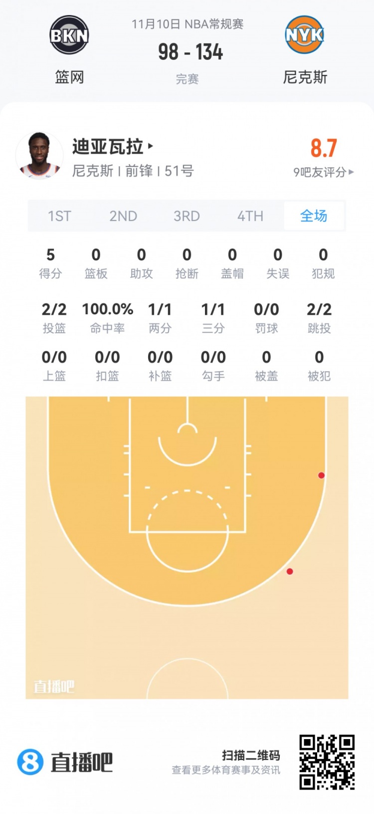 尼克斯次轮51号秀穆罕默德·迪亚瓦拉登场5.2分钟