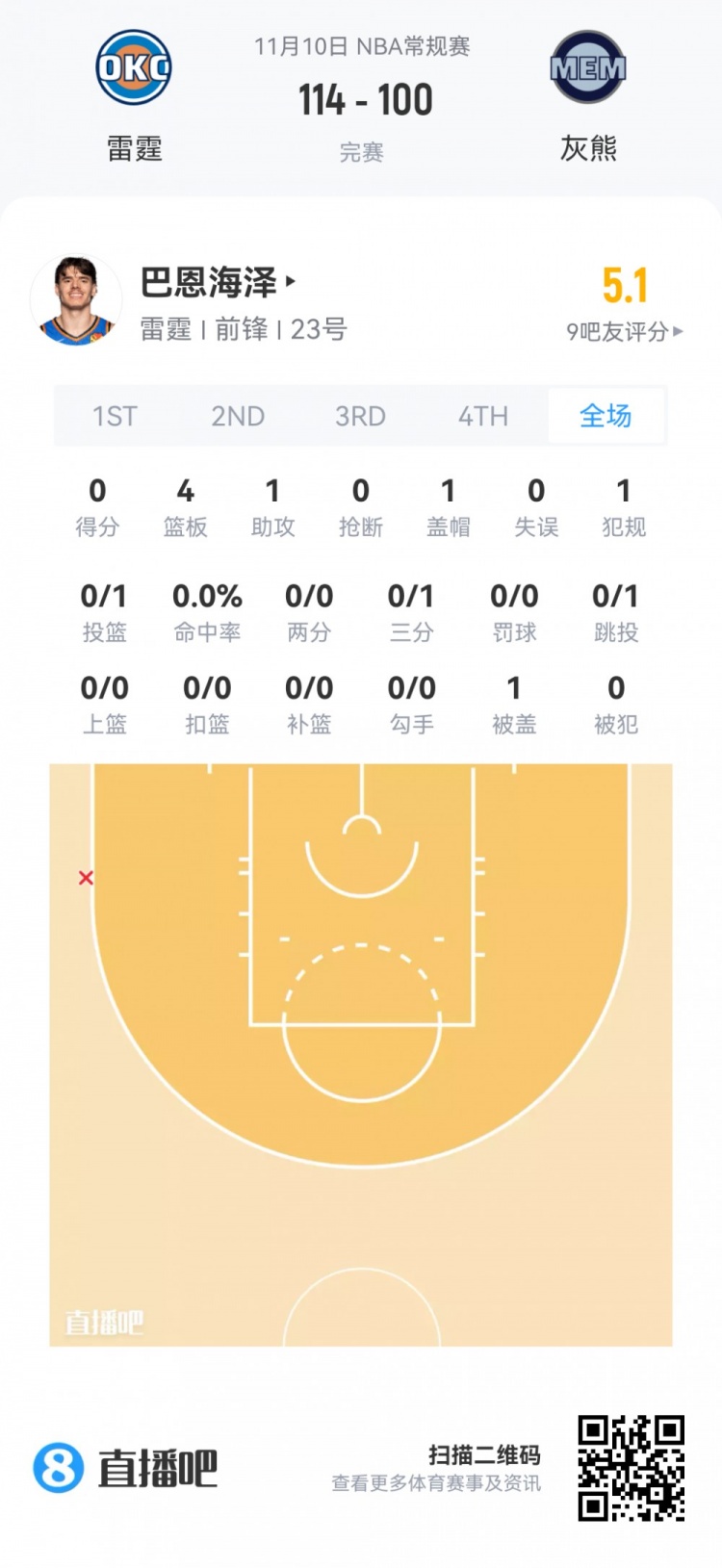 雷霆次轮44号秀布鲁克斯·巴恩海泽登场7分钟