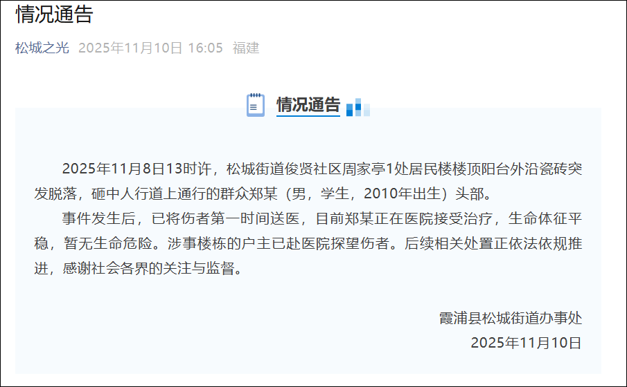2025年11月8日13时许,松城街道俊贤社区周家亭1处居民楼楼顶阳台外沿瓷砖突发脱落,砸中人行道上通行的群众郑某(男,学生,2010年出生)头部。