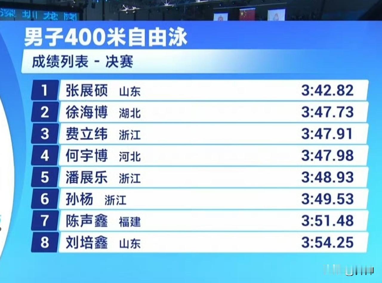 恭喜!2007年出生的张展硕,在今天晚上进行的第十五届全运会男子400米自由泳决赛中,以3分42秒82的成绩,打破他本人的3分42秒99的世界青年纪录,斩获冠军!张展硕和潘展乐将是中国游泳队2028洛杉矶周期自由泳项目的领军人物! 老将孙杨,斩获第6名