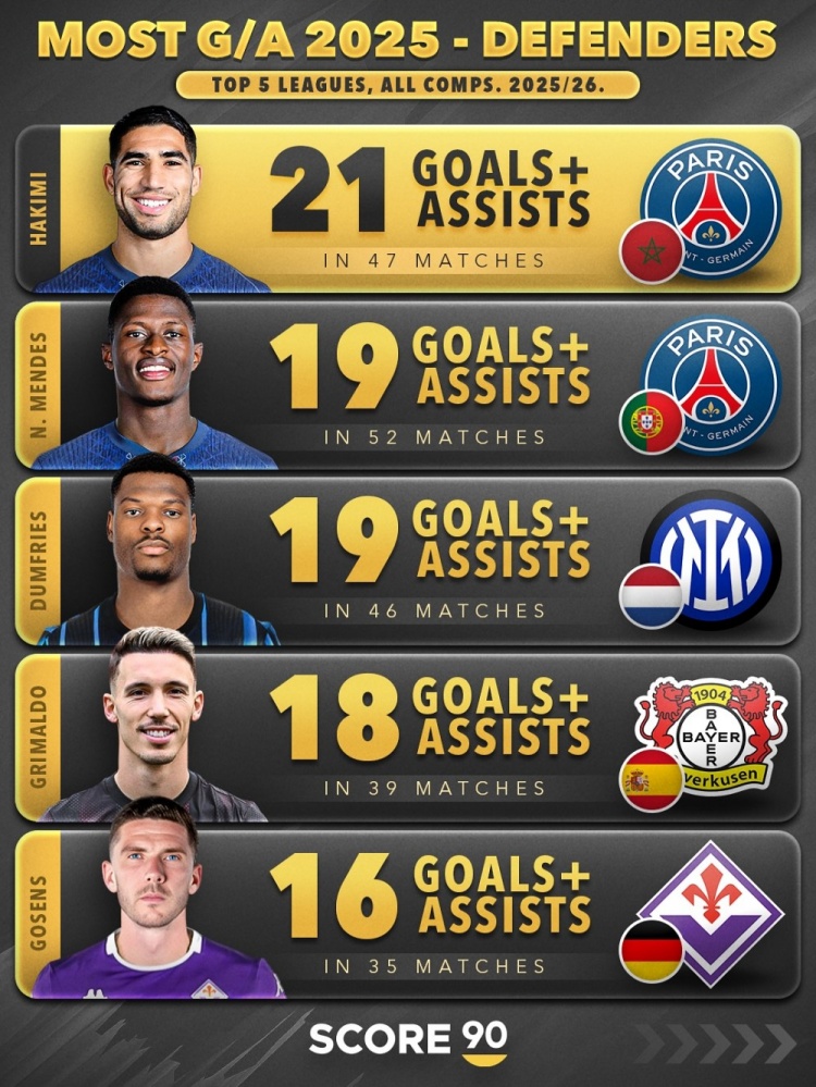直播吧11月10日讯Score90统计了2025年五大联赛后卫在俱乐部+国家队比赛中参与进球的数量,并列出榜单。
