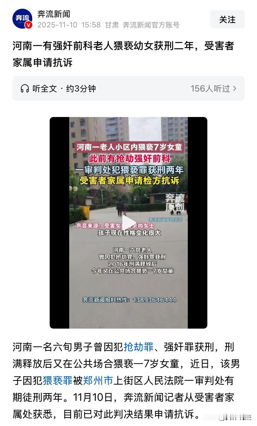 河南郑州,6旬老人因抢劫、强奸被判处有期徒刑4年,出狱9年后又在自家小区门口诱骗同一小区7岁小女孩到小区花园玩耍,利用与小女孩独处的机会,将手伸进小女孩的衣内实施猥亵,被判处有期徒刑2年,小女孩家属不服,认为判得太轻,申请抗诉! 据悉,6旬老人殷某曾在2012年因犯抢劫、强奸罪被法院判处有期徒刑4年,2016年刑满释放。 2025年2月4日下午,殷某在自家小区门口逗留时,看到邻居家7岁的小女孩又起了歹心,诱骗对方到小区花园玩耍,期间,见四下无人,利用独处的机会,将手伸入小女孩的衣内实施猥亵。 随后,小女孩反抗而后逃离并将自己的遭遇告诉家人,小女孩的母亲当即便报了警。 报警次日,警方将殷某抓获,而后以涉嫌猥亵儿童罪对殷某立案调查,查明上述事实后,依法移送检方审查起诉。 随后检方审查起诉后对殷某提起公诉。小女孩一方也提起了刑事附带民事诉讼,要求殷某赔偿35万元损失。 近日,该案有了结果,法院指出殷某系有前科人员,此次在公共场所当众猥亵不满12周岁的儿童,性质恶劣,应依法从重处罚。庭审中,殷某虽对罪名无异议,但否认部分关键事实,法院认定其当庭供述避重就轻,未如实陈述,故不予从轻处罚,最终以猥亵儿童罪判处殷某有期徒刑2年。 而刑事附带民事部分,法院认为,小女孩一方提出的35万元赔偿请求,因未提交证据且缺乏法律依据,没有支持。 不过对于这样的结果,小女孩的母亲并不满意,决定向检察机关申请抗诉,民事部门向法院提起上诉。 小女孩的母亲表示,自己并没有出具谅解书,法院也认定了众多从重情节,但是最后量刑却选择了最轻的。 警方抓殷某时,殷某在家躲了一天都不开门,最后是撬门进去抓的殷某,庭审时公安机关的材料中提及是将殷某抓获归案,但是最后法院认定的却是殷某系家中传唤到案,自相矛盾! 事发后,还在小区遇到殷某的家人,被殷某的家人挑衅,自己报警后,警方并没有处理。 经历这件事后,小女孩的性格变化很大,以前是个特别外向的孩子,现在不愿意与异性接触,每天也不愿意出门,晚上睡觉还经常做噩梦,哭个不停。 那从法律上该如何看待此事呢? 《刑法》第237条第3款规定,猥亵儿童的,处5年以下有期徒刑;有下列情形之一的,处5年以上有期徒刑: (一)猥亵儿童多人或者多次的; (二)聚众猥亵儿童的,或者在公共场所当众猥亵儿童,情节恶劣的; (三)造成儿童伤害或者其他严重后果的; (四)猥亵手段恶劣或者有其他恶劣情节的。 具体到本案,小区花园很显然属于公共场所,这里的“当众”并不要求有人看到,只要有被不特定的人看到的可能即可认定为“当众”,一审法院既然已经认定在公共场所当众猥亵不满12周岁的儿童,性质恶劣,应依法从重处罚,在殷某还存在具有前科等其他从重情节的情况下,至少应当判处殷某5年以上有期徒刑,最终只判处殷某2年有期徒刑确实说不过去! 最高院关于适用《刑事诉讼法》的解释第175条第1、2款也规定,被害人因人身权利受到犯罪侵犯或者财物被犯罪分子毁坏而遭受物质损失的,有权在刑事诉讼过程中提起附带民事诉讼;被害人死亡或者丧失行为能力的,其法定代理人、近亲属有权提起附带民事诉讼。因受到犯罪侵犯,提起附带民事诉讼或者单独提起民事诉讼要求赔偿精神损失的,人民法院一般不予受理。 出于对未成年人的保护以及对针对未成年人犯罪的打击,两高《关于办理强奸、猥亵未成年人刑事案件适用法律若干问题的解释》第14条特别规定:对未成年人实施强奸、猥亵等犯罪造成人身损害的,应当赔偿医疗费、护理费、交通费、营养费、住宿伙食补助费等为治疗和康复支付的合理费用,以及因误工减少的收入。根据鉴定意见、医疗诊断书等证明需要对未成年人进行精神心理治疗和康复,所需的相关费用,应当认定为前款规定的合理费用。 具体到本案,从案情报道来看,小女孩受到的伤害主要是精神损害,如果想要获得赔偿,则需要提供鉴定意见、医疗诊断书等证明小女孩精神受损以及治疗所需费用,如果小女孩一方在一审时没有提供,一审法院不予支持并无不当。 最后,不管如何!本案都再次提醒广大家长朋友们,防人之心不可无! 一定要从小培养孩子的安全意识,教导孩子对可疑行为保持敏感,拒绝陌生人不合理的请求,明确告知孩子身体隐私部位不可被触碰,遇到侵犯需立即反抗并寻求帮助! 这事您怎么看?欢迎在评论区留言,与大家一起交流您的看法! ------ 关注@安律说法 案例中看人生百态,法律中寻破局之法!