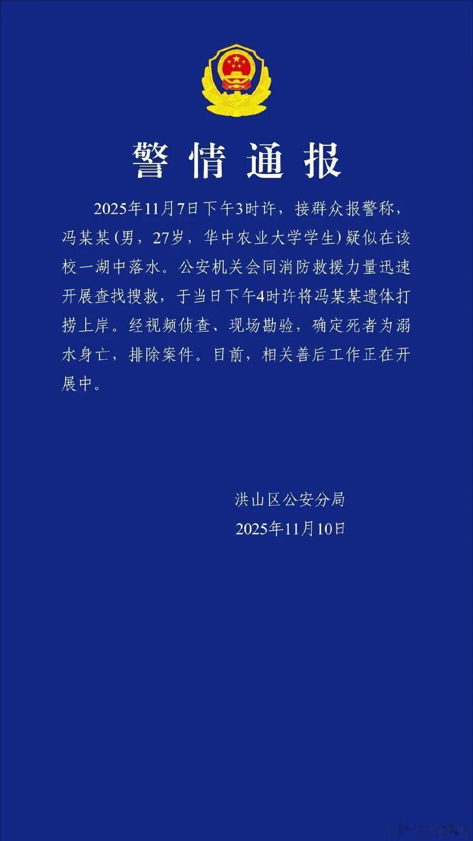 2025年11月7日下午3时许,接群众报警称,冯某某(男,27岁,华中农业大学学生)疑似在该校一湖中落水。公安机关会同消防救援力量迅速开展查找搜救,于当日下午4时许将冯某某遗体打捞上岸。经视频侦查、现场勘验,确定死者为溺水身亡,排除案件。目前,相关善后工作正在开展中。