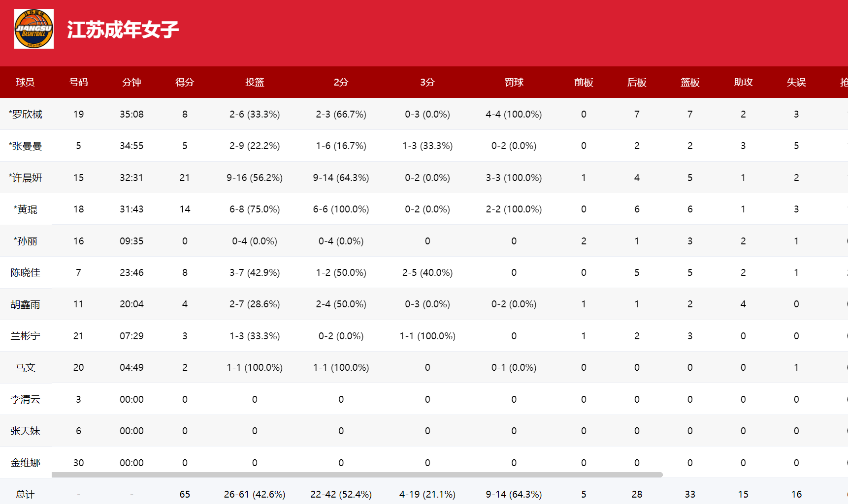 江苏女篮:许晨妍21分5板,黄琨14分6板,罗欣棫8分7板。