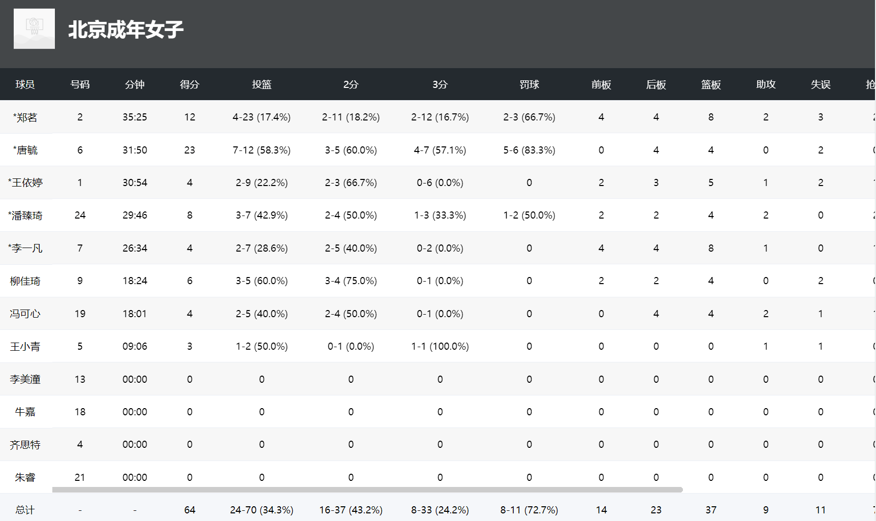 北京女篮:唐毓23分4板,郑茗12分8板,潘臻琦8分4板。