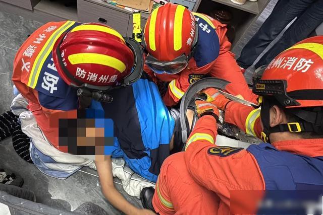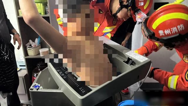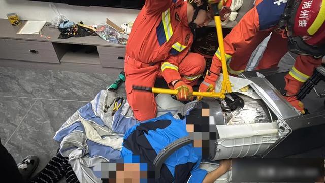 一名11岁的小男孩跪坐在洗衣机内筒之中