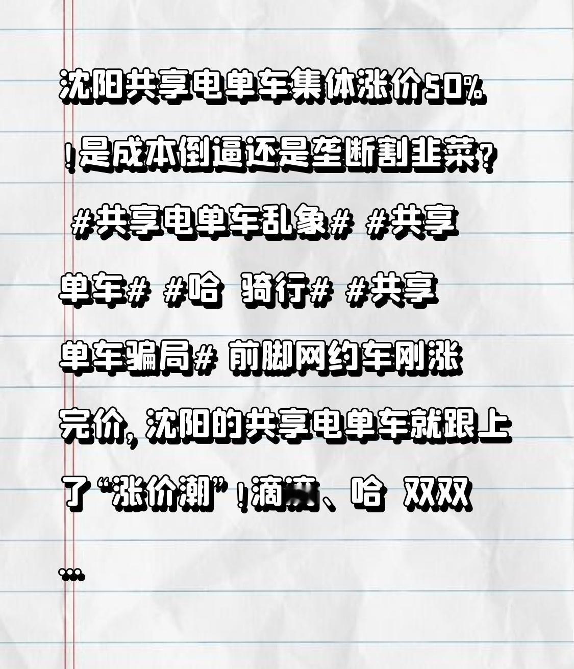 沈阳共享电单车集体涨价50%!是成本倒逼还是垄断割韭菜? 共享电单车乱象 共享单车 哈啰骑行 共享单车骗局 前脚网约车刚涨完价,沈阳的共享电单车就跟上了“涨价潮”!滴滴、哈啰双双官宣调价:起步价从“前20分钟3元”直接砍到15分钟3元,意味着常见的18分钟通勤路,费用从3元飙到4.5元,涨幅硬生生冲到50%。有通勤族算过账:每天早晚各骑一次,一个月要多花近百元,这价格都快追上拼车网约车了——冬天顶着寒风骑电单车,性价比还不如坐有空调的网约车,图啥? 更耐人寻味的是,两家平台几乎同步调价,美团虽暂未跟进,网友却直言“迟早会跟风”,质疑这是“默契垄断”。企业给出的理由很统一:锂电池、运维人力、车辆折旧成本都在涨,不涨价难维持运营。但消费者可不买账:“一辆电单车采购成本2000-3000元,3-6年折旧,现在骑行订单这么多,真的亏吗?”“以前靠低价抢市场,现在没了竞争对手就涨价,这不是割韭菜是什么?” 有人吐槽“戴头盔都要2分钟,实际骑行13分钟就收3元,吃相太难看”,也有人理解“运维要换电池、调车辆,成本确实不低”。更扎心的是,沈阳冬天骑行本就遭罪,涨价后不少人直接放弃电单车,转而选择网约车或公交——可网约车今年6月也刚涨过价,短途出行的“平价选项”难道要消失了? 一边是企业喊着“成本压力大”,一边是消费者抱怨“出行成本越涨越高”,你觉得这次共享电单车涨价合理吗?是该为企业生存买单,还是该抵制这种“垄断式涨价”?