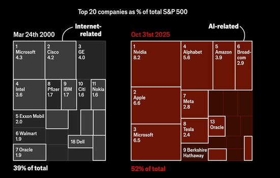 更严重的是对整体经济的风险敞口。家庭股票配置已达创纪录水平,《经济学人》估算显示,如果AI科技估值出现裂缝,仅通过财富效应对消费的冲击就将拖累GDP下滑2.9%。美国经济对AI的依赖程度已达到危险水平。