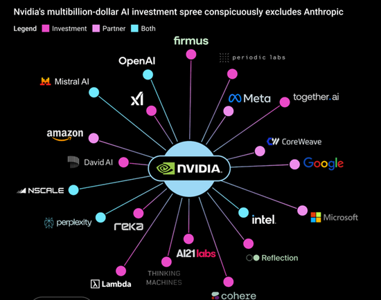 产业集中度同样令人担忧。CBInsights数据显示,英伟达几乎支撑着每一个主要AI参与者,除了Anthropic之外。这种高度集中的供应链结构放大了系统性风险。