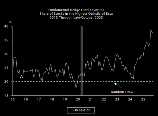 最值得关注的是对冲基金行为的变化。EmpiricalResearchPartners指出,基本面对冲基金已“拥抱高贝塔股票”,即大型科技AI宠儿。换言之,对冲基金的偏好股票已与散户投机者别无二致,专业投资与投机资金在同一赛道上拥挤不堪。