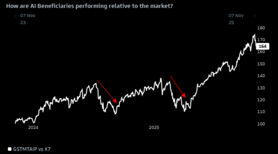 历史数据显示,AI相关股票此前曾多次出现相对市场的大幅回调,随后才被资金逢低买入。高盛的分析表明,AI投资并非只涨不跌的神话。