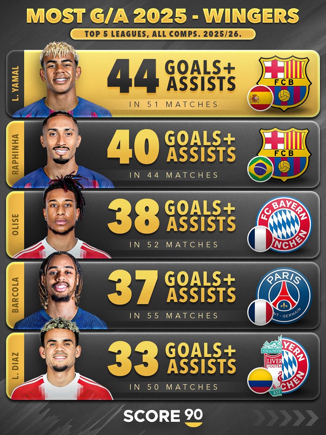 虎扑11月10日讯Score90统计了2025年在各项赛事(包括俱乐部和国家队)中参与进球最多的五大联赛边锋球员:
