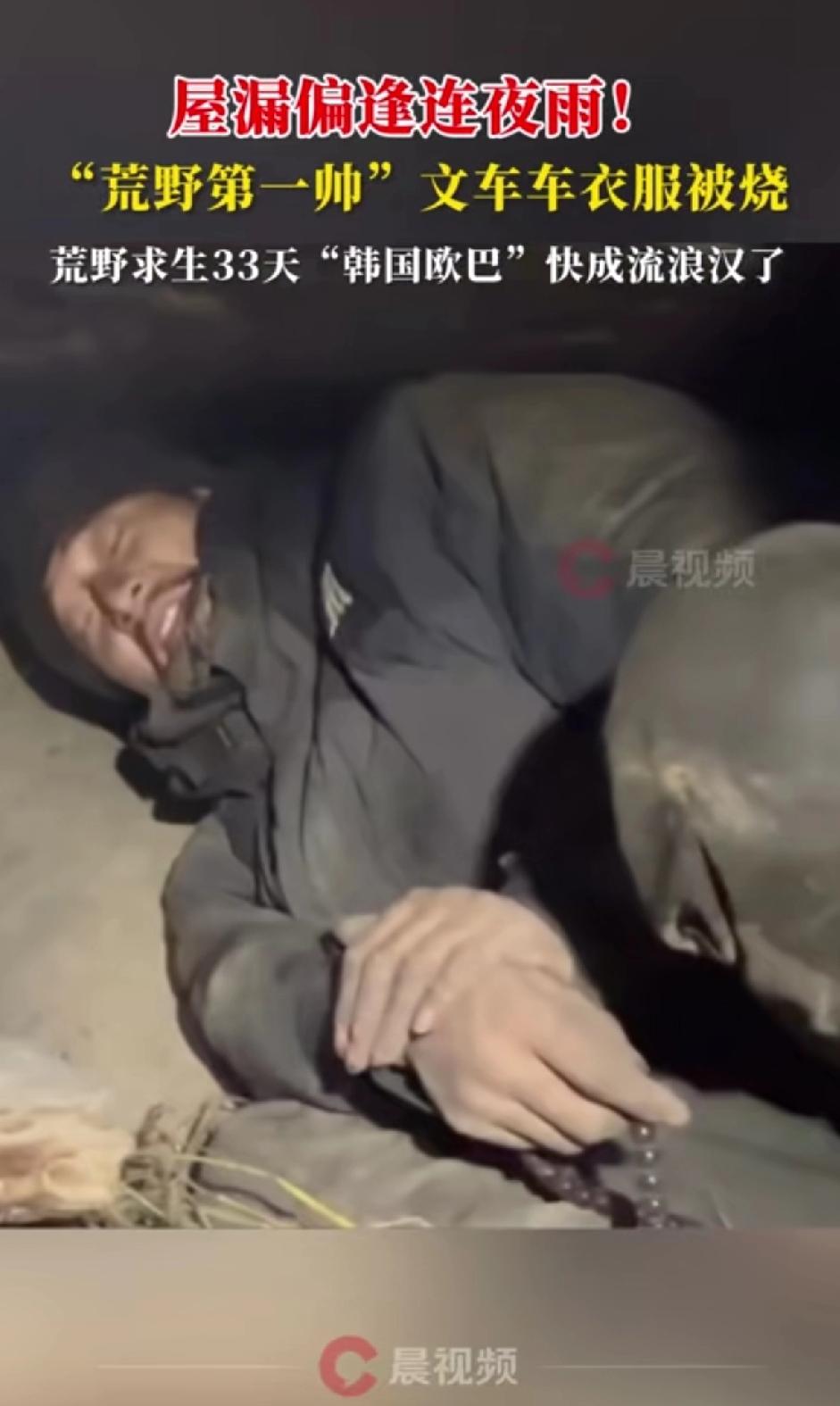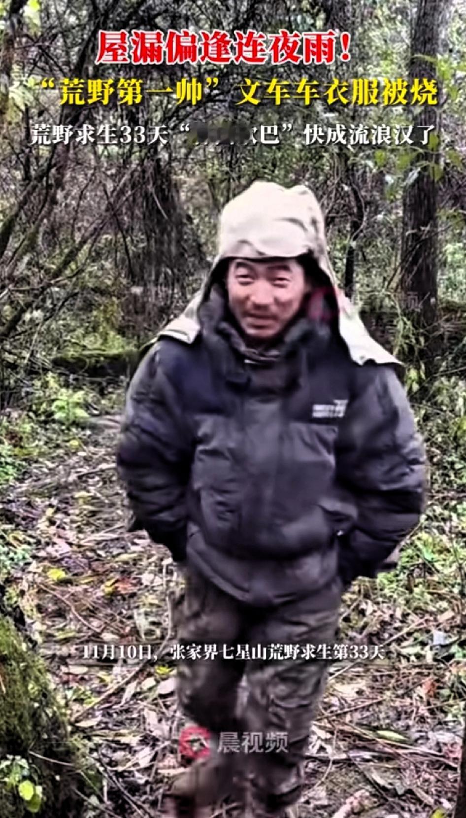 “荒野求生第一帅哥”选手文车车!曾经被网友称赞“荒野第一帅” 文车车烤火衣服被烧了好几个大洞! 荒野求生33天“酷似韩国欧巴”的文车车快成流浪汉了!要我说还不如流浪汉。 流浪汉可以捡拾,可以改变自己,参加荒野求生比赛,在恶劣的环境下没法改变自己。 这位来自陕西宝鸡的帅哥,只能由帅气的大哥,变成胡子邋遢的流浪汉了![笑哭][笑哭] 都说文车车是第二届荒野求生比赛所有选手里最帅的一位选手! 看来再帅气的长相也是经不住饥寒交迫的折磨。 有没有发现图二的文车车现在特别像河南籍演员“张立”? “饿”的都是脱相了。 一直没报道他是怎么坚持下来的,只记住他长的帅,而忽略了他的生存能力。 这次烤火把衣服烧了好几个洞,天气越来越湿冷,又是下雨,这时候出现任何情况就能决定是否能进入决赛。 衣服坏了可是个不好的苗头!看看林北把自己都快变成烤肉了,也没把衣服烧坏,那小子还是很聪明的。 自从看了荒野求生比赛,看他们都生火成功了,我也耐不住好奇的心,在小区捡了块木头回去试着钻木取火。 女儿在旁一边喊着加油,一边鼓励妈妈是最棒的,最终试了三次,每次都坚持不到30秒就放弃了。 实在使不上劲,手都快磨出泡了,木头还是原封不动在那里。 木头没有一丝变化的杵在那里,它既没有说话,也没有开口嘲笑我。 而我像斗败的公鸡一样垂头丧气! 不尝试永远不知道有多困难。经历过一次生火就让我对他们佩服的五体投地!更何况还坚持了33天。 这两天荒野求生比赛中,陆续有人退出,看来这场大雨会让比赛提前进入决赛。 期待到底花落谁家?谁能最后夺得冠军!领20万大奖。