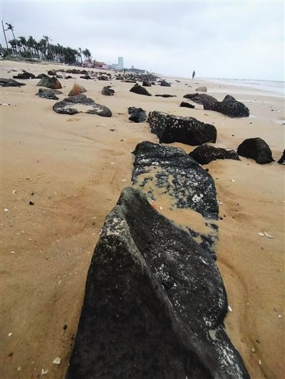 针对林女士反映的情况,记者近日到现场走访看到,海滩上有多个装着垃圾的编织袋,还有许多形状不规则的石块。有的石块边缘又薄又尖锐,如刀刃一般。但仔细观察可发现,这些石块大多颜色较深且表面光滑,也有“体型”较大的大石板,表面呈蜂窝状,应是长期受海水冲刷所致,不像近期刚被倾倒的建筑垃圾。更令人不解的是,这些石块并非集中堆放,而是沿着海岸线呈线状分布,从北洋港妈祖庙附近一直向东延伸,连绵一公里以上。