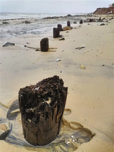 “海边经常刮北风,久而久之防潮堤的残留部分就被海沙和淤泥掩埋了。”周安平表示,从2015年到2023年期间,都没有超大台风影响到这片海滩。去年的超强台风“摩羯”也曾让残留物裸露,但不久后又被海沙淤泥覆盖了。今年第21号台风“麦德姆”对海口的影响较大,“台风一刮,把覆盖在(防潮堤残留物)上面的海沙和淤泥都刮到海里去,那些石块、钢筋、木桩等就裸露出来了,这也算是自然现象吧。”