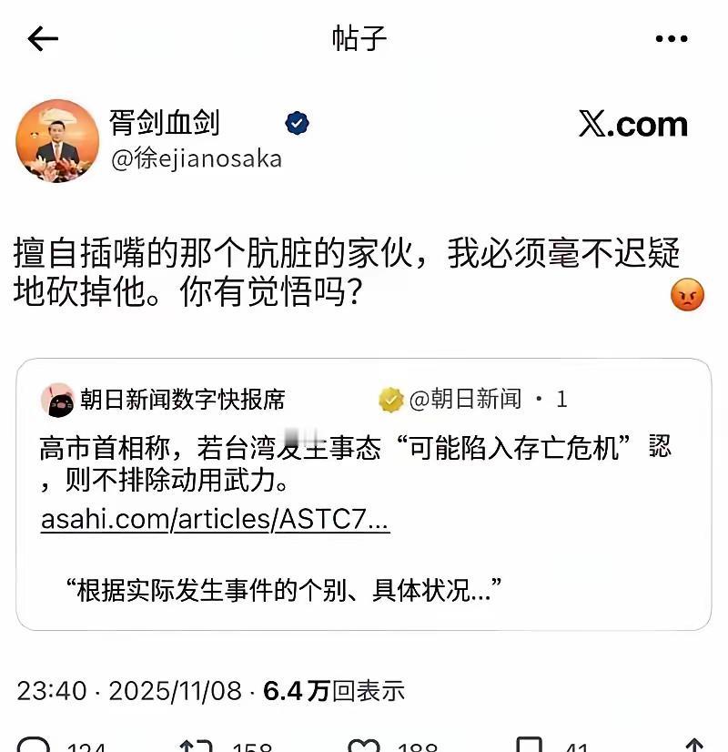 中国外交官一句“斩首说”,直接把日本舆论炸翻了天! 起因是日本新首相高市早苗放狠话,说“台湾有事”日本就动武。中国驻大阪总领事薛剑直接回怼:“斩掉那擅自闯入的肮脏头颅,你做好心理准备了吗?” 这话一出,日本立马炸锅,又是喊着“宣战”,又是要“驱逐外交官”。可问题是,台湾是中国内政,轮得到日本指手画脚吗? 现在的中国早就不是百年前任人宰割的样子了。你都把刀架到别人脖子上了,还不许人家说句硬话?薛剑的话,与其说是威胁,不如说是给日本敲警钟:别玩火,玩脱了后果自负。 你觉得中国外交官的回应够不够硬气?来评论区聊聊你的看法~