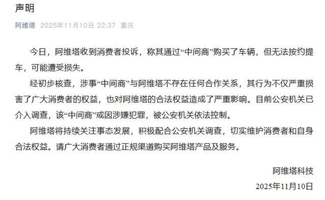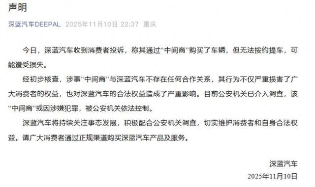 今日,深蓝汽车、阿维塔科技收到消费者投诉,称其通过“中间商”购买了车辆,但无法按约提车。对此,深蓝汽车、阿维塔科技就相关情况已发布声明。