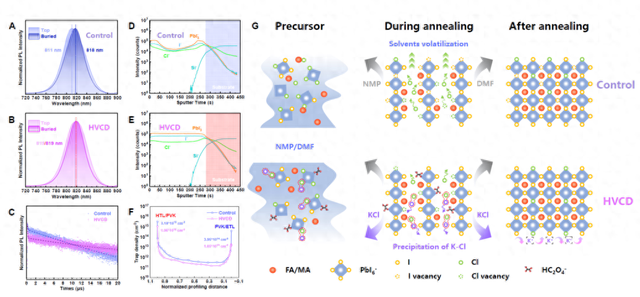 科研团队通过在钙钛矿薄膜生长中引入碱金属草酸盐,利用解离出的钾离子与氯离子之间的强结合作用,有效束缚氯元素的垂直无序迁移,使其在钙钛矿材料中均匀分布。基于这一方法,研究团队成功制备出载流子寿命高达20微秒,界面缺陷态密度低至10每立方厘米的钙钛矿半导体薄膜。
