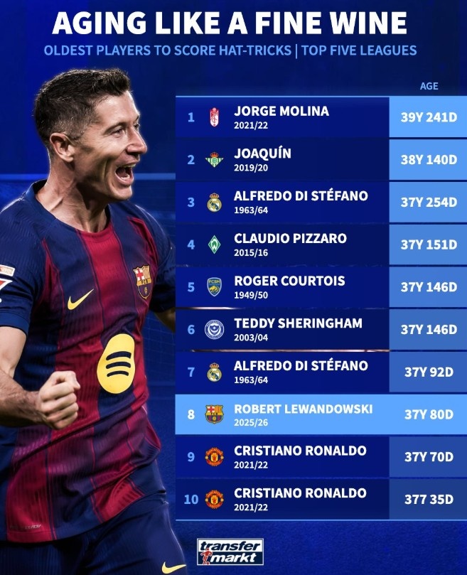 8、莱万(巴萨,2025-26赛季):37岁80天
