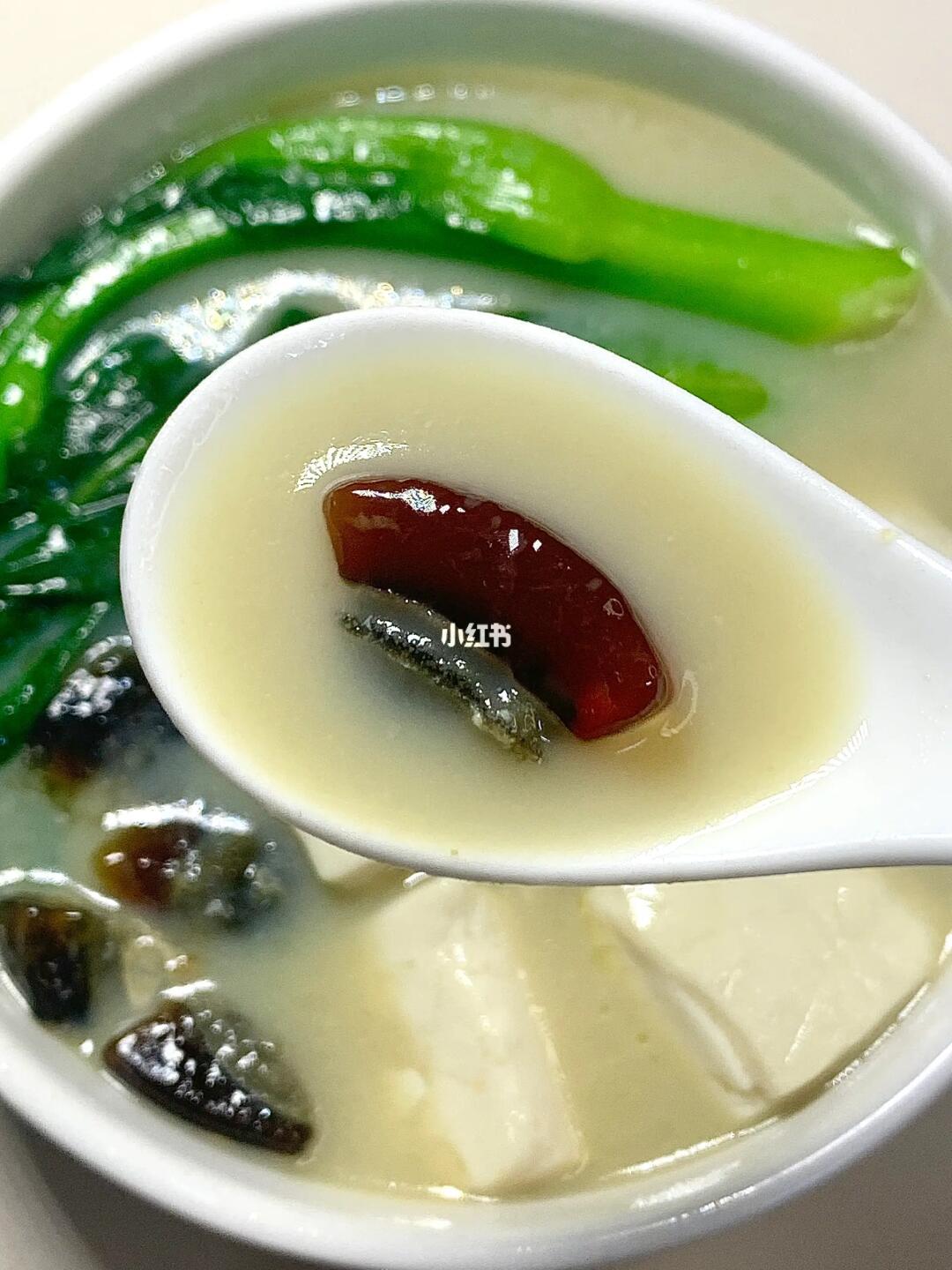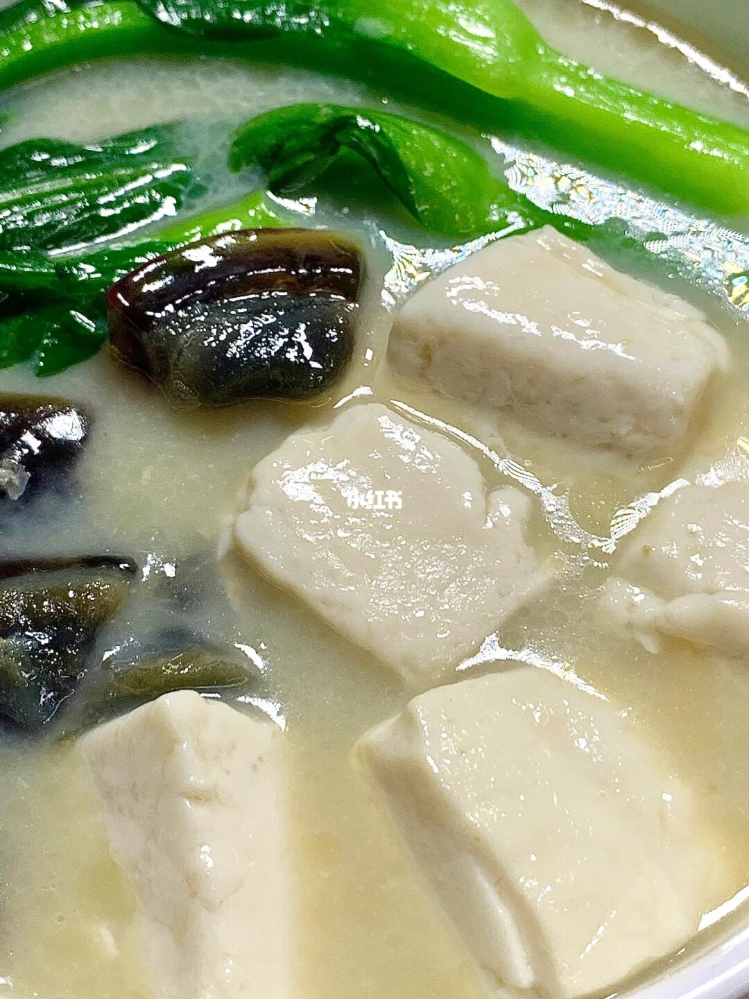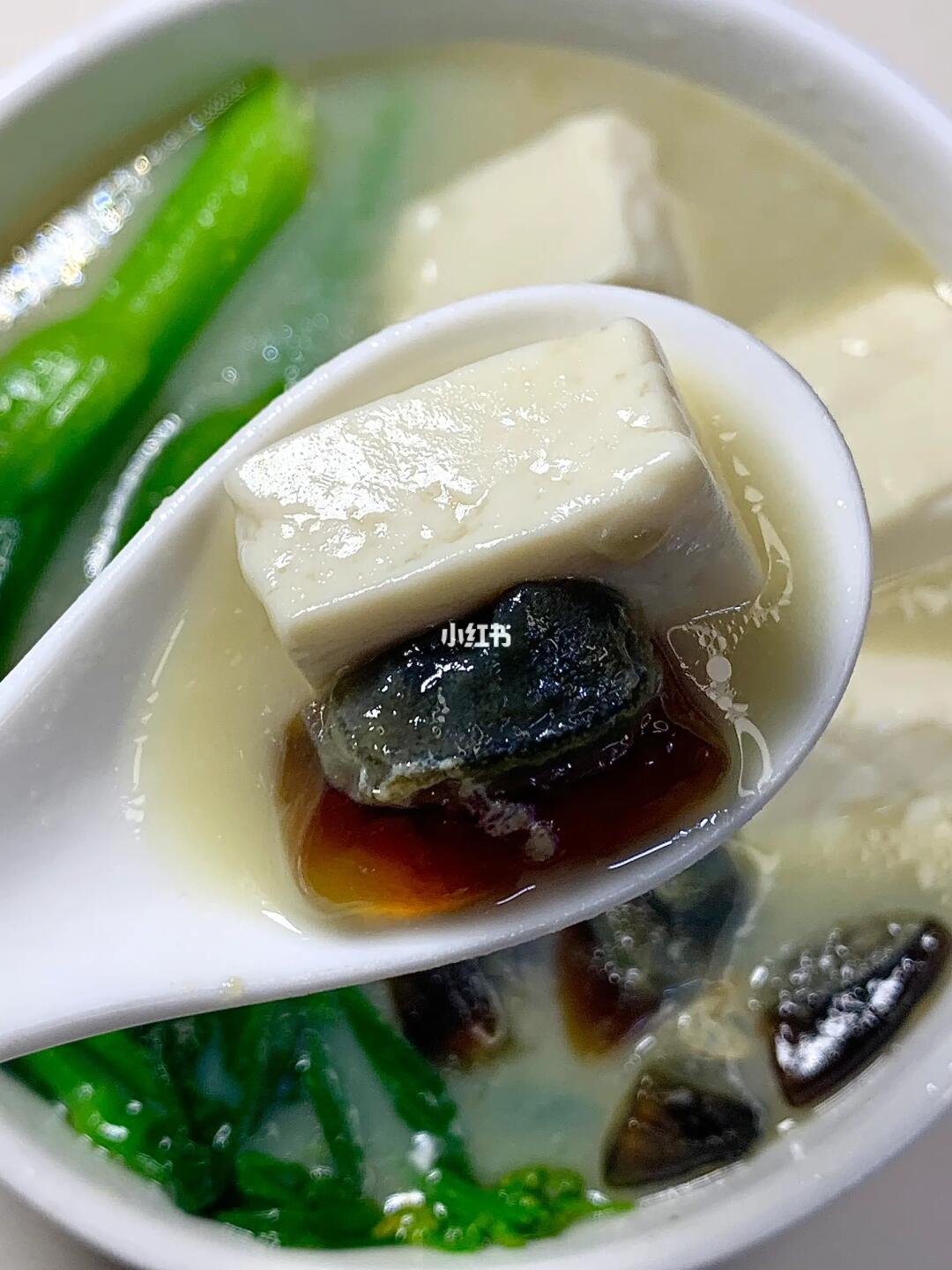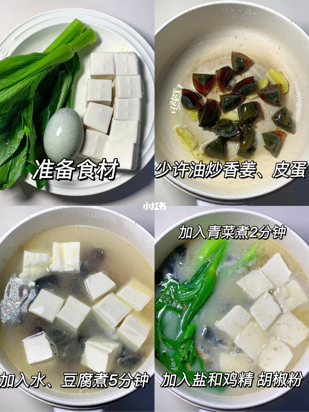 皮蛋豆腐汤真的鲜掉毛!!! 太好喝了!低卡又营养!! 做法超简单!几分钟就能搞定! 真心推荐给所有减脂的姐妹们[飞吻R] [彩虹R]食材:豆腐 皮蛋 菜心 [种草R]做法:少许油炒香姜 皮蛋+加入适量开水放豆腐煮5分钟 放入菜心煮至断生+适量盐和鸡精 白胡椒粉调味即可✅