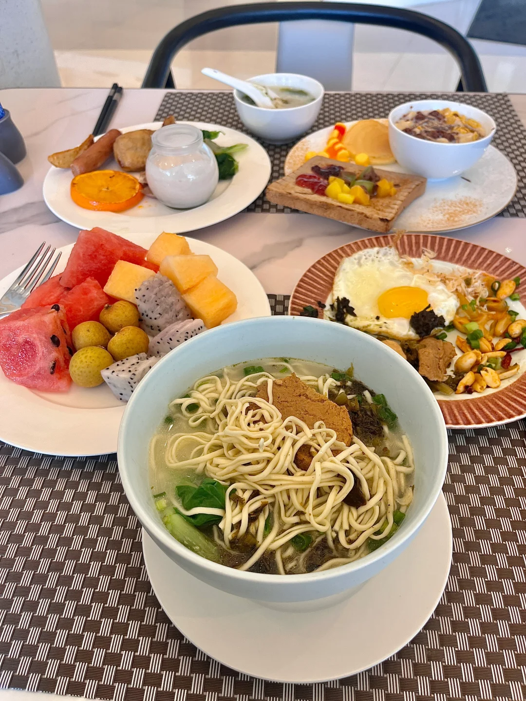 早餐丰盛,中西结合,基本想吃的都有,营养均衡,还有现煮的面条也可安排,还能鲜榨水果汁,炒饭炒菜粥还是吐司甜甜圈沙拉都嘎嘎不错
