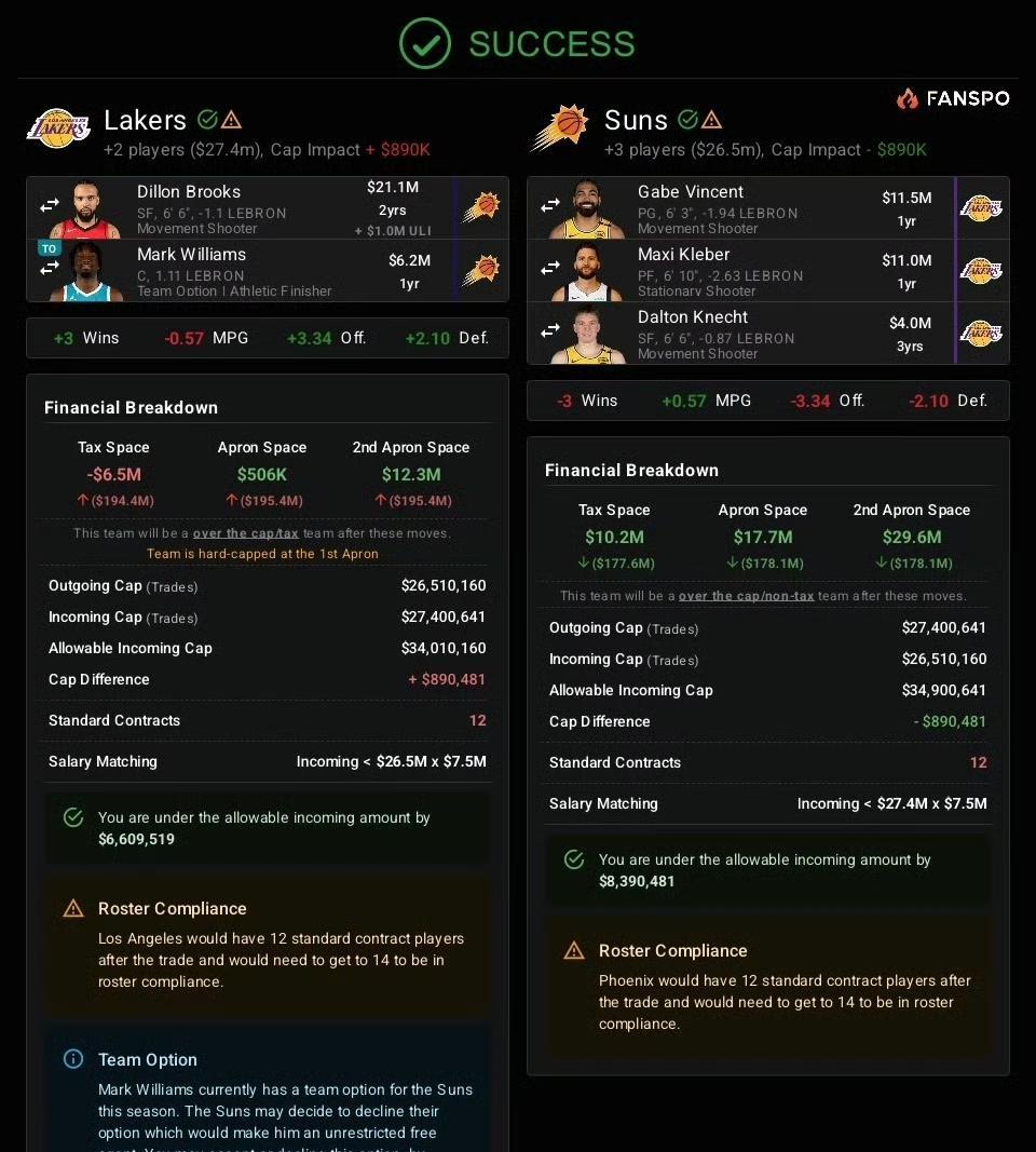 梦想单:文森特+克莱伯+克内→狄龙+马威 湖人距离第一土豪线112万美元,交易完成后总薪资上浮89万美元,可行。 效果:外线攻防能力瞬间提高档次,内线储备更加丰富。湖人提升为联盟一档球队。 核心要素:变废为宝