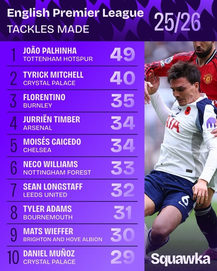 直播吧11月11日讯英超联赛已经进行了11轮,squakwa也统计了本赛季英超抢断次数情况,拜仁外租的帕利尼亚居首。