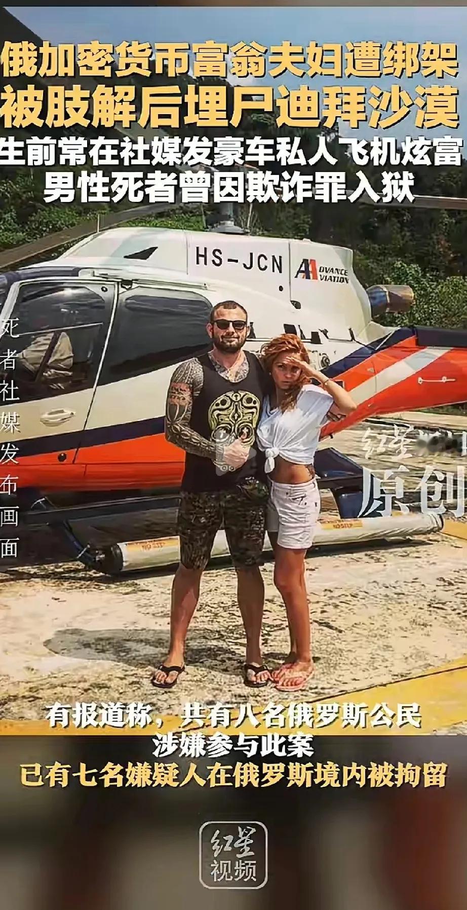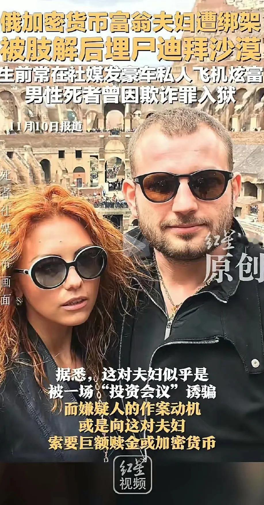 国外富豪夫妇,因为经常在社媒体炫富,发豪车,私人飞机。导致心怀不轨的人,心生贪恋,想办法绑架了这对夫妻。 疑似嫌疑人索要巨额赎金,或者是加密货币。 最后悲剧还是发生了。 男人生前因为投资,欺诈同伙,被告入狱六年。 出狱后移居国外。 赚钱要走正道,更不要炫富,仇富的人太多了。
