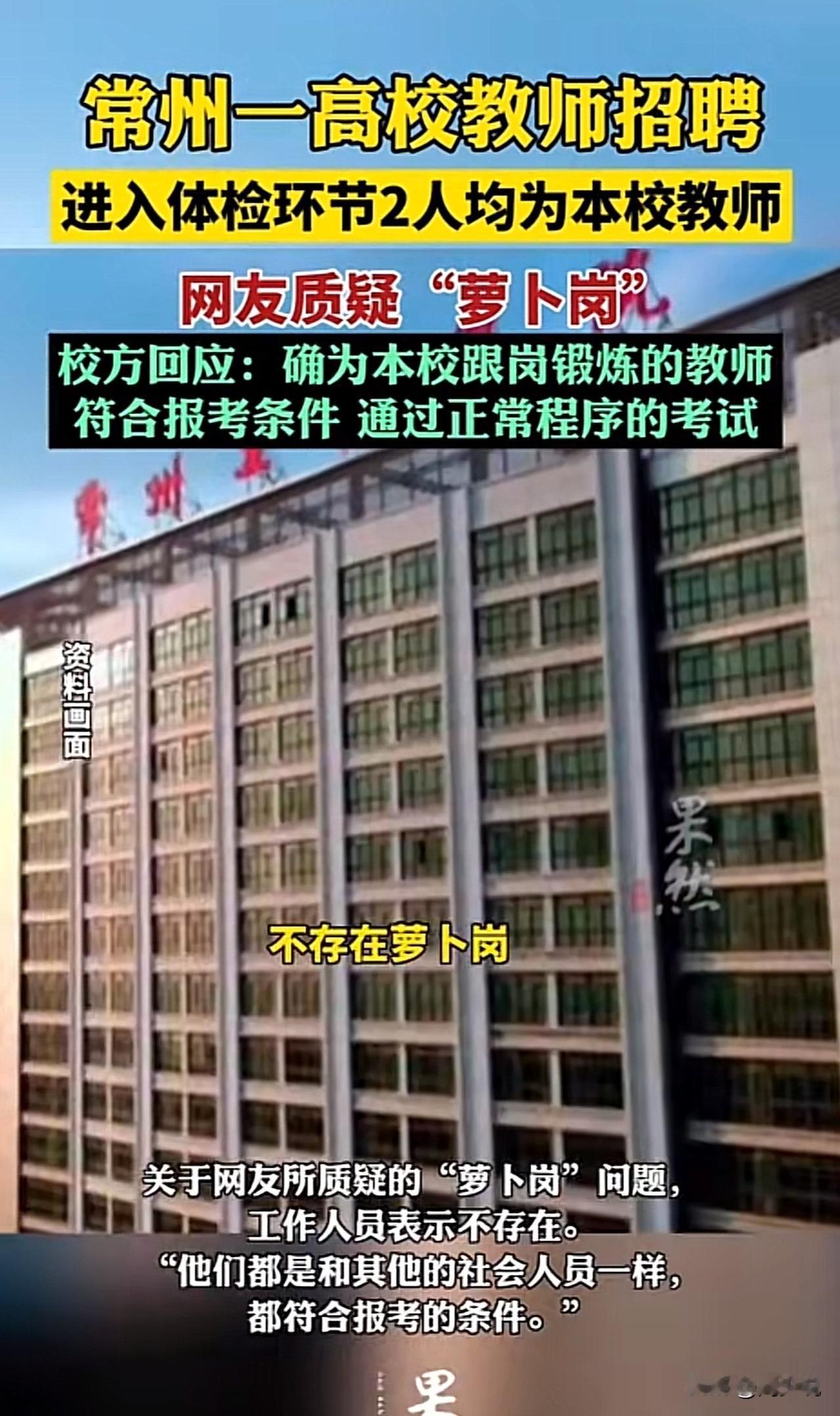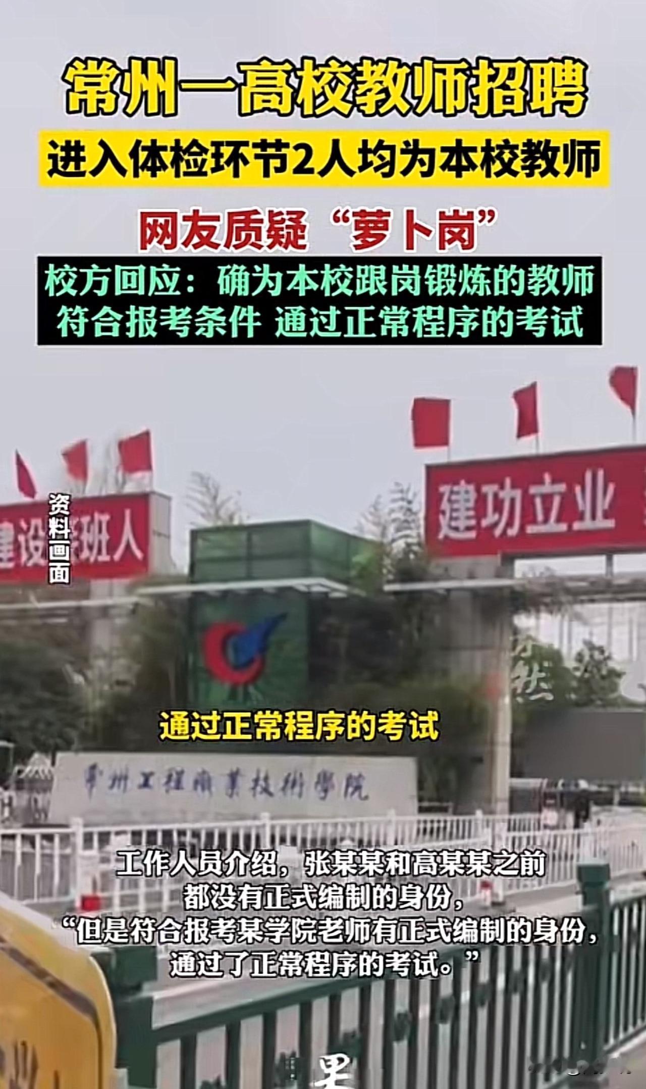 #常州一高校回应招聘质疑#罕见,常州一高校招聘2人均为校内职工引质疑,网友吵翻了!学校回应:绝非萝卜岗! 近日,有网友发帖质疑常州工程职业技术学院思政课教师招聘(事业编)为“萝卜岗”,只因最终进入体检的2人张某某、高某某均为该校职工,其中张某某被指曾任校团委副书记、学院副院长,高某某为专任教师。 网友截图佐证官网及公众号曾有相关任职介绍,帖子迅速引发热议,不少人质疑招聘公平性。 针对此情况,学校回应,两人此前无正式编制,符合报考条件,均通过正常考试流程,不存在“萝卜岗”;张某某的副院长、团委副书记身份系宣传失误,并非真实任职。 此事曝光后,网友看法不一。有网友说:“希望公开完整考试流程,用透明打消疑虑”! 也有网友称:“宣传失误太牵强,细节得说清楚才让人信服”! 还有网友则表示:“只要程序合规,校内职工考上也合理”。 在周少看来,招聘争议的核心是“透明性”。校内职工入围本无可厚非,但宣传信息与官方回应矛盾、关键流程未详细公示,难免引发质疑。 而且,更重要的是,高校作为事业单位,招聘需以绝对公开、可追溯的流程筑牢公信力,唯有把规则晒在阳光下,才能真正打消公众疑虑,守住公平底线。#MCN双量进阶计划# #寻美三湘#